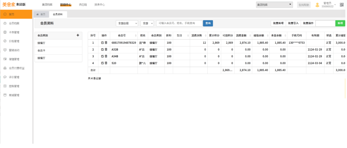 目录 搜索 美食家集团版学习指南后台管理系统概述使用须知注册说明登录说明开店向导后台首页一、集团档案基础信息品项管理品项档案品项类别品项单位口味档案加料档案品项规格品项部位订单渠道关联管理品项口味品项加料品项推荐门店品项管理店铺管理桌位管理桌位管理排队等位类别打印管理票据设置厨打设置营业设置前台开关与设置支付设置销售设置平板点餐设置抖音设置发票设置POS授权营业管理费用管理营业外收支单营业外收支汇总营业外收支明细分账管理分账设置分账参数设置分账账号管理分账管理分账方案批次分账分账报表分账流水报表分账转出汇总分账转入汇总机构管理品牌管理品牌管理门店管理门店区域门店管理店组管理店员管理店员管理个人账号公司信息商户资料短信管理短信查询短信群发短信设置增值服务思迅聚合外卖外卖账户外卖门店设置外卖订单汇总报表外卖订单明细报表团购券核销汇总团购券核销明细电子发票思迅图文识别账户管理门店账号设置微餐厅设置扫码点餐扫码点餐设置商户设置店铺装修管理店铺装修模板扫码点餐装修微客宝微预订设置门店小程序码微外卖微外卖设置配送设置公众号设置商家公众号设置公众号菜单设置系统设置其他设置数据导入数据清理系统日志服务中心产品下载小程序和桌贴帮助中心二、营销中心会员档案基础信息会员资料会员类别会员标签会员日志会员设置会员设置会员储值会员升级设置积分规则会员日设置积分报表管理会员积分卡券管理优惠券管理优惠券管理券包管理价格管理促销活动当前促销促销计划套餐热卖折扣方案促销汇总品项价格管理品项调价单品项历史价格查询营销活动会员拉新注册有礼免费领取拼团消费激励消费满额精准营销千人千面会员互动摇奖活动报名活动抽奖活动会员关怀完善资料有礼生日赠送唤醒有礼累计有礼会员分销老带新充值有礼老带新消费有礼券分享有礼储值管理充值营销充值赠送小额储值首次充值赠送会员生日充值赠送会员日充值赠送会员付费权益付费权益会员付费权益包付费券包评价管理评价查询评价设置挂账管理挂账会员结算商城管理商品类别商品资料订单管理积分交易报表三、供应链基础档案基础信息原料信息原料配比物料默认设置供应商信息供应商档案采购管理采购业务采购订单采购收货采购退货补货向导配送管理配送业务调拨单要货单调拨差异单配送向导配送调价单生产管理(开发中)加工业务生产入库单库存管理库存业务库存初始化库存调整单成本价调整单转仓单报损单领用单盘点批号库存管理库存查询结算中心供应商结算供应商对账供应商预付款单供应商费用单供应商结算单门店结算配送门店结算单门店销售账款单门店销售结算单门店费用单报表分析采购查询采购单据汇总采购类别汇总品项采购汇总采购日汇总供应商采购汇总采购明细采购月汇总采购订单跟踪配送查询调拨汇总要货状态跟踪 调拨明细 要货汇总门店要货汇总配送毛利配送价历史价格库存报表出入库品项汇总报表出入库明细报表库存告警盘点漏盘报表盘点明细报表原料成本分析盘点差异报表盘点差异结算分析供应商往来账款门店销售账款配送结算分析门店往来账款系统设置采购设置配送设置库存设置四、报表中心运营汇总报表收银情况查询综合营业统计收银流水收银汇总收银员汇总付款方式汇总上缴金额报表反结账报表退单流水收入构成分析优惠构成统计区域桌位区域桌位营业统计桌位收入统计转台情况查询品项销售报表品项销售查询品项销售流水品项销售汇总连锁销售排行品项毛利汇总订单查询套餐销售流水品项销售汇总分析门店品项销售汇总退赠改品项赠送汇总品项赠送明细退项记录口味加料口味加料统计分析提成查询服务员提成查询点项员提成查询推销员提成查询营销员销售情况会员营销报表会员交易会员消费汇总会员消费明细会员挂账统计会员新增情况会员复购统计会员交易明细储值分析会员储值汇总会员储值明细储值卡支付记录会员财务汇总会员财务情况统计每日会员储值情况统计会员储值购券汇总会员储值购券明细储值消费汇总营销分析会员分销业绩表优惠券营销汇总优惠券营销明细券包销售查询券包销售分析会员拼团统计权益包销售查询会员查询会员基础信息数据下载清单数据导出Windows系统前台安装登录营业点单订单交易会员管理厨打设置参数设置外设设置其他设置页面设置登陆背景图其他更多参数备份报表中心决策分析说明运营汇总报表收银情况查询综合营业统计收银流水收银汇总退单流水收入构成分析优惠构成统计区域桌位区域桌位营业统计品项销售报表品项销售查询品项销售流水品项销售排行类别销售排行品项销售汇总门店品项销售汇总品项销售汇总分析退赠改品项赠送汇总退项汇总品项改价统计口味加料口味加料统计会员营销报表会员查询会员基础信息会员交易会员交易明细储值分析储值消费汇总百度人脸识别操作手册纸质券使用手册 暂无相关搜索结果! 本文档使用 MinDoc 发布 会员资料 介绍:可以新增会员、查看会员信息或者是对会员信息进行修改和删除。操作:点击“新增”,录入会员号、姓名、会员类别、手机号、生日等信息,点击保存,即会员新增成