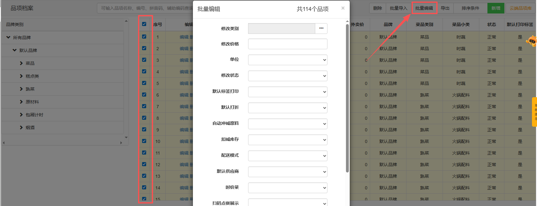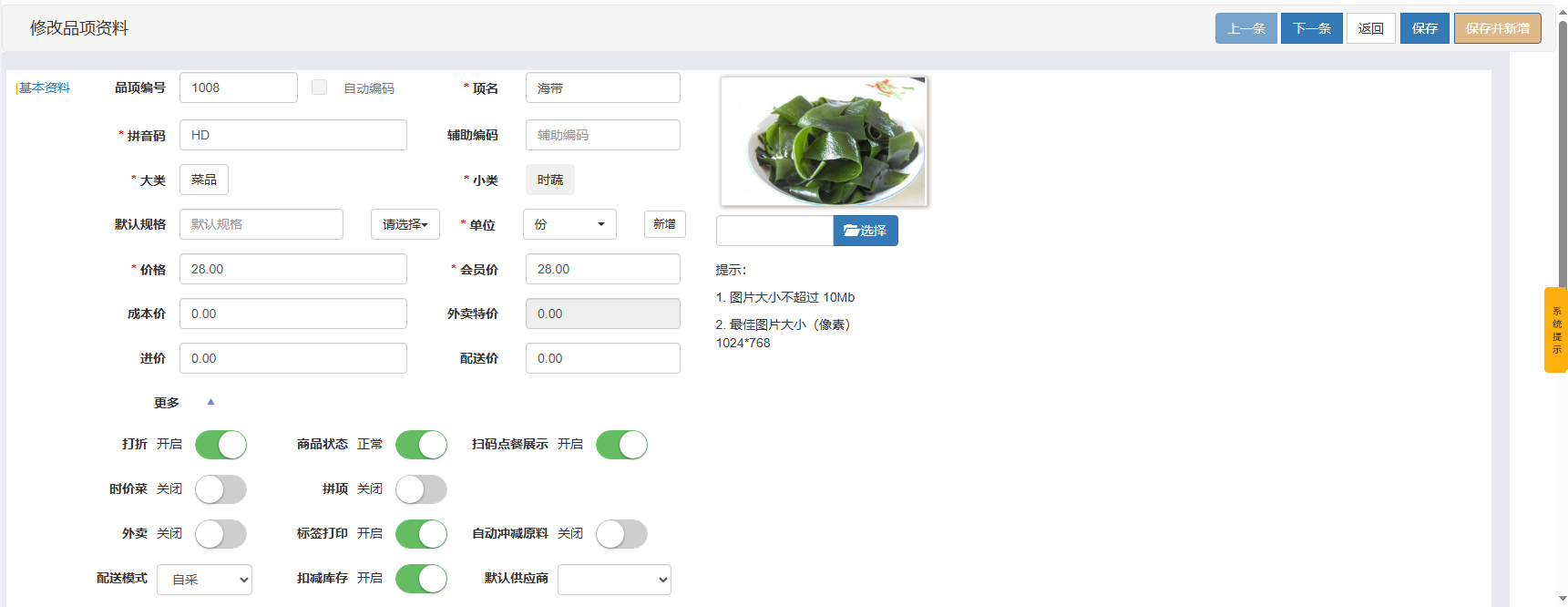 用于设置品项的详细信息,包括编号、名称、价格、规格及各类经营参数。主要功能包含品项的新增、删除、批量导入、批量编辑、导出等,是餐饮业务管理的基础核心档案。