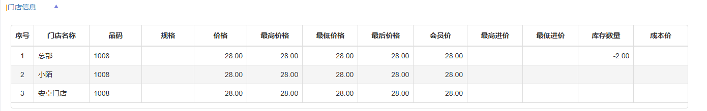 按照门店展示当格价、最高价格、最低价格、最后价格、会员价、、最高进价、最低进价、库存数量、成本价;