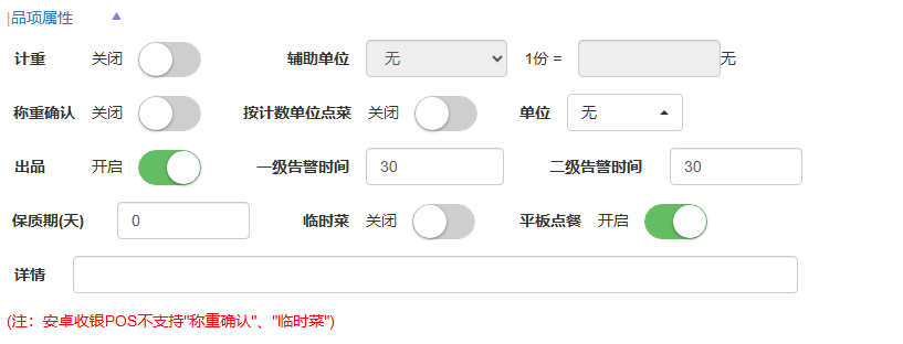 - 外卖:开启之后,外卖中可看到此品项,且可以设置品项外卖价格