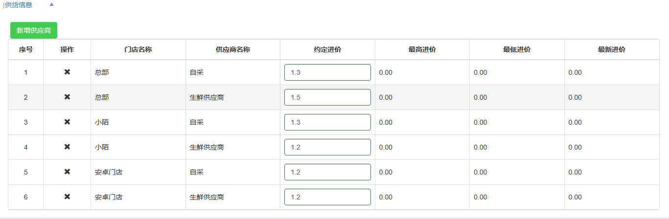 此处显示该品项关联的供应商及约定进价、最高进价、最低进价、最新进价;