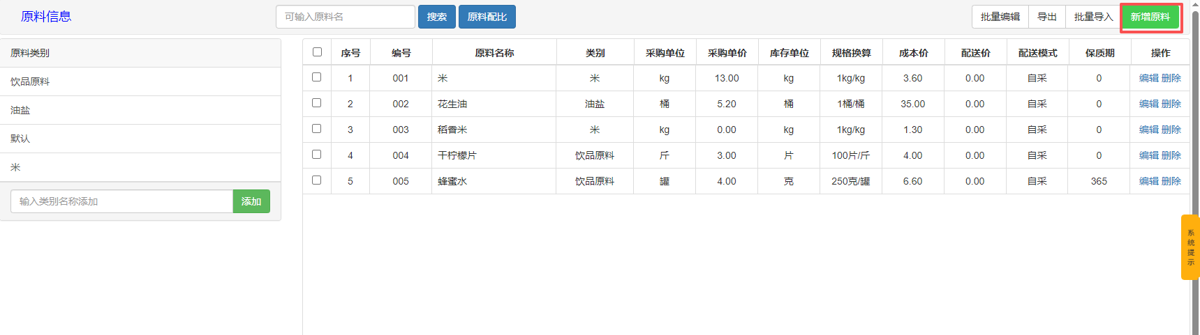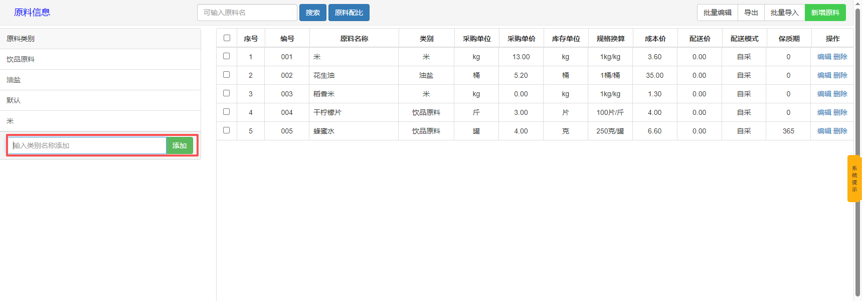 1、在原料管理界面,首先录入原料类别,点击【添加】按钮完成类别创建。