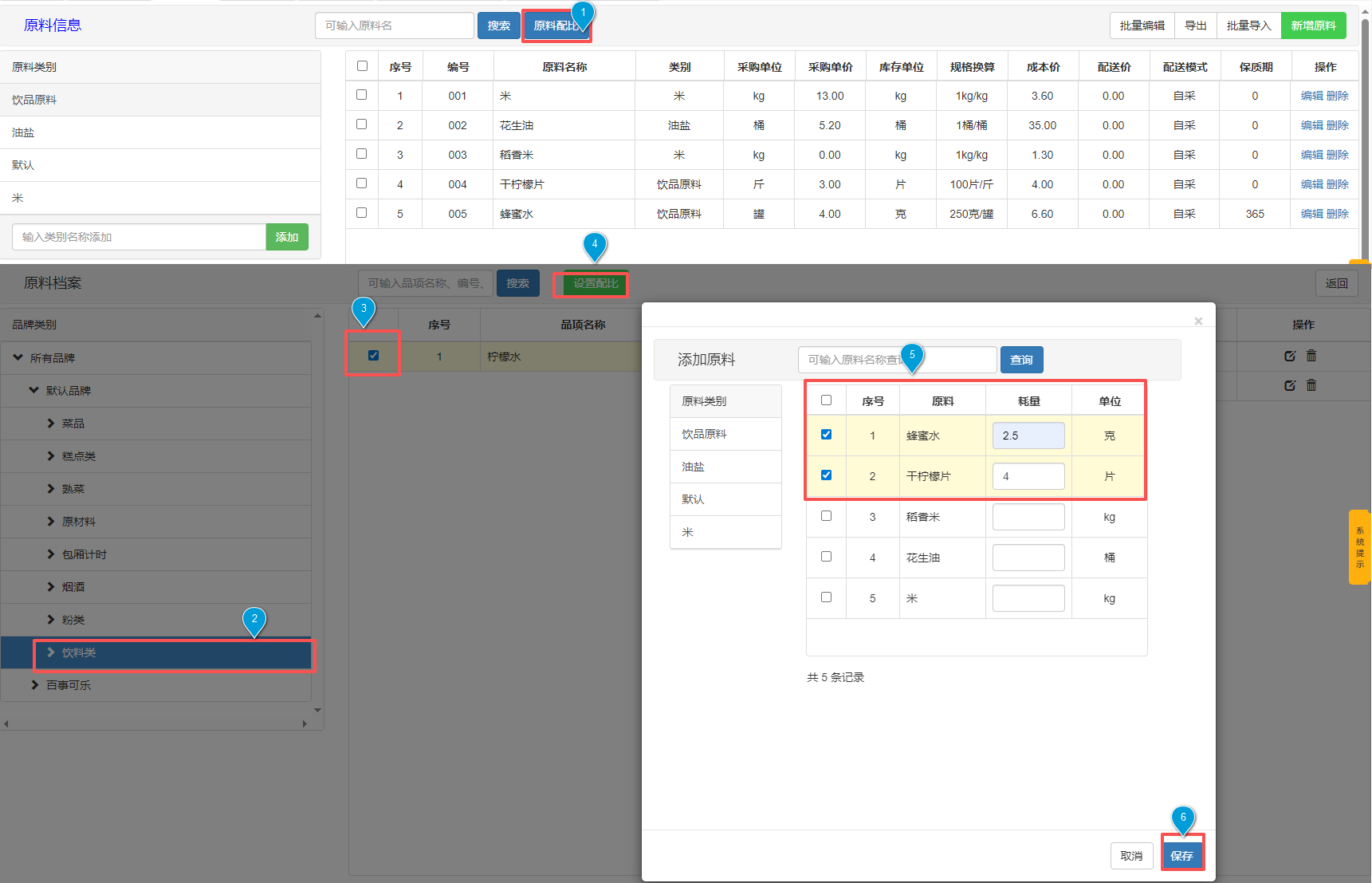 为每种原料设置耗量(即制作一份该品项所需的原料数量)。