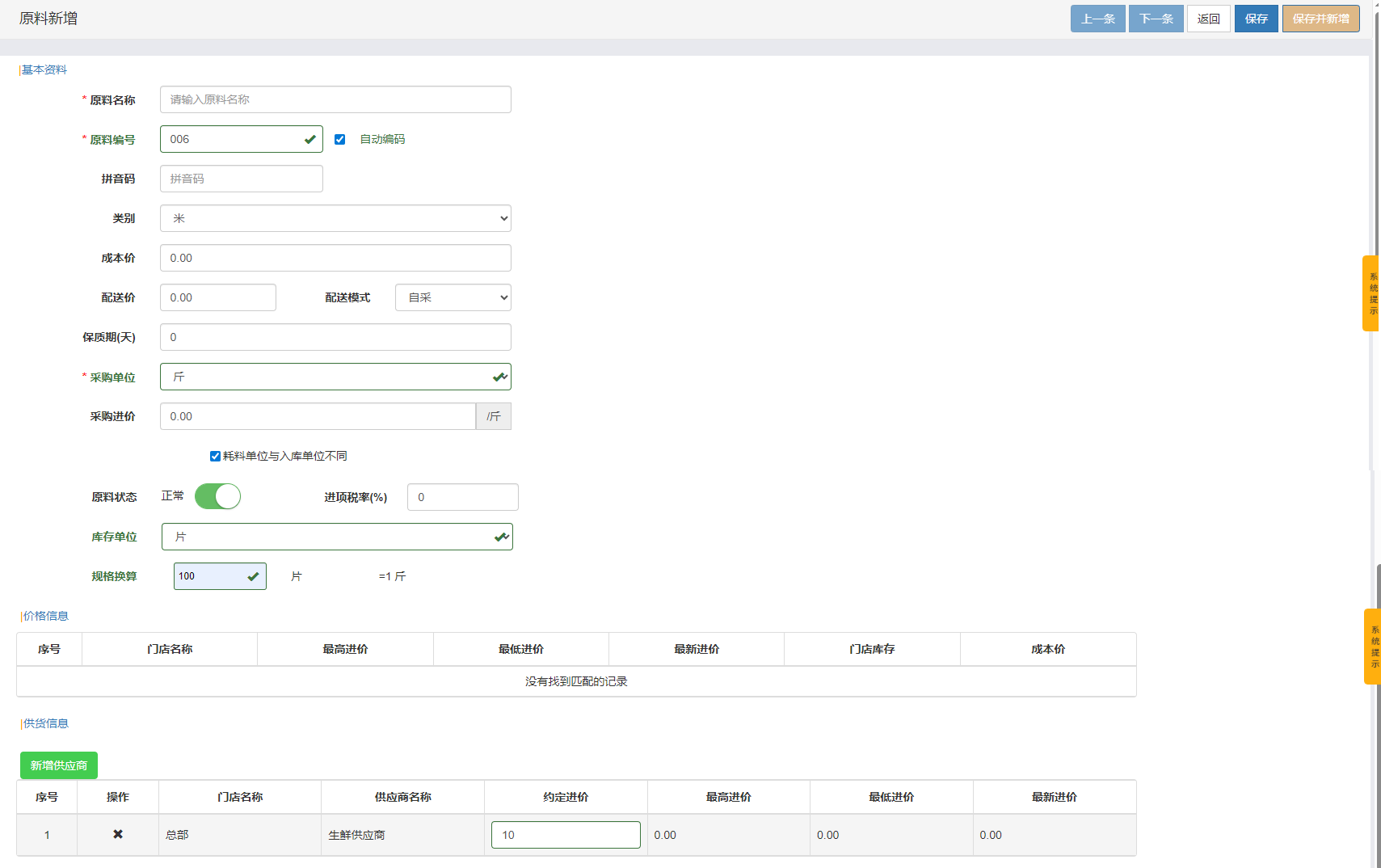 2、点击【新增原料】,录入以下信息:
