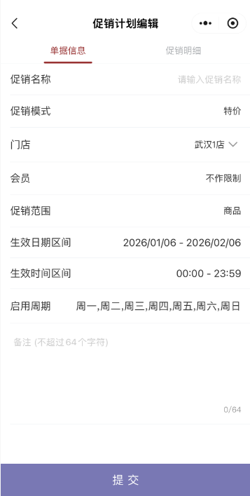 点击新增促销,填写单据信息和促销信息后提交即可。