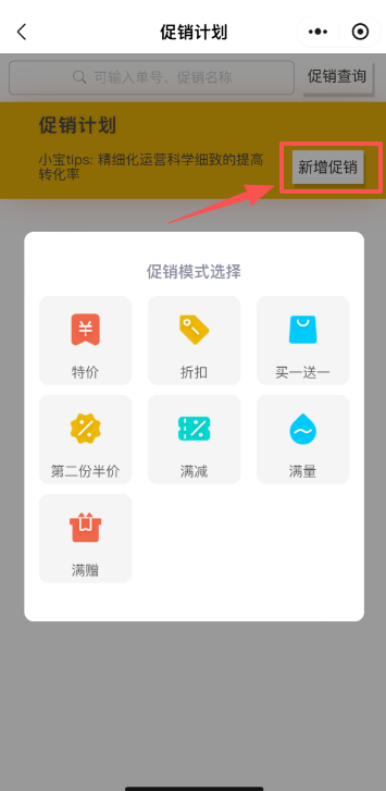 促销计划,可以新增和查询促销,促销计划包含特价、折扣、买一送一、第二份半价、满减、满量、满赠。
