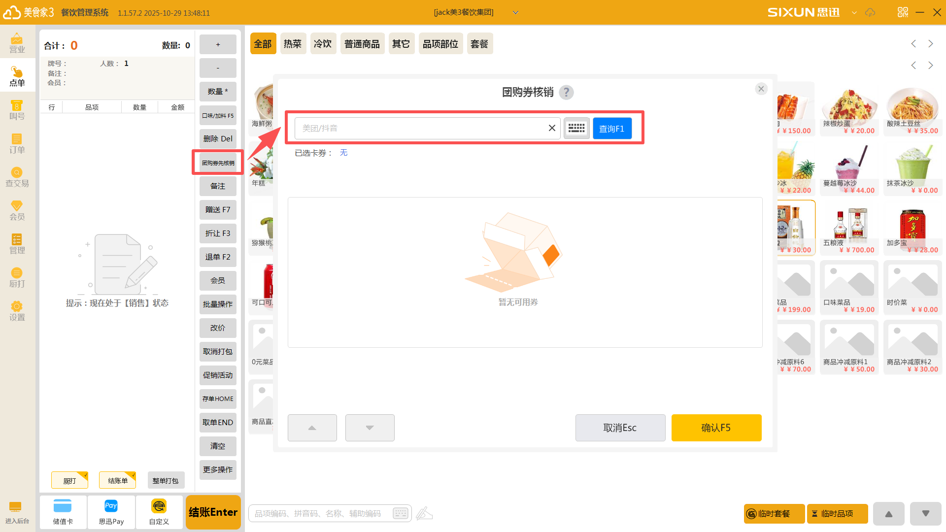 1.2 快餐具体操作:门店前台POS点单界面,无需点菜,点击“团购劵先核销”(前台低于1.1.57.2的版本名称为“前置核销”),扫描顾客手机端出示的抖音团购券码,完成核销。