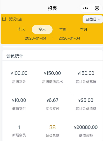 当前门店,累计会员消费金额,只要录入了会员,没有使用储值卡余额支付,也会统计。