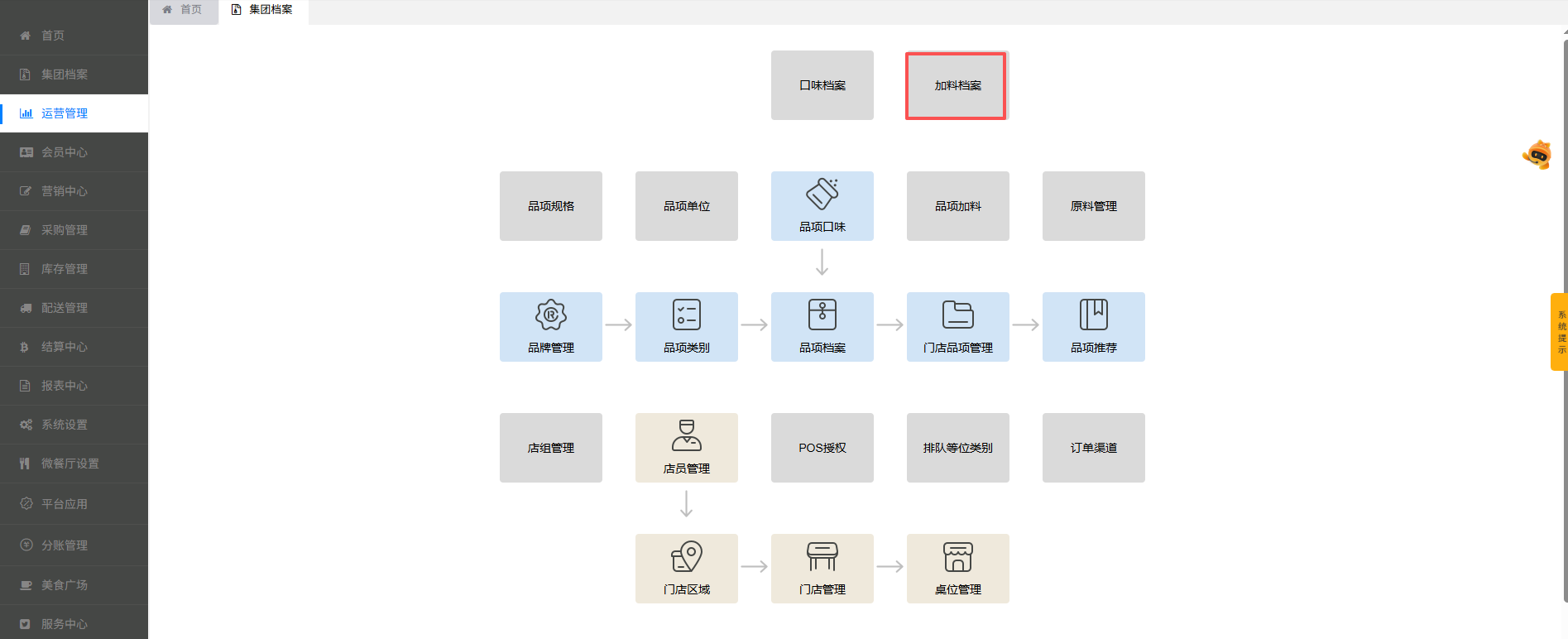 在后台【集团档案】中,点击【加料档案】进入管理界面。