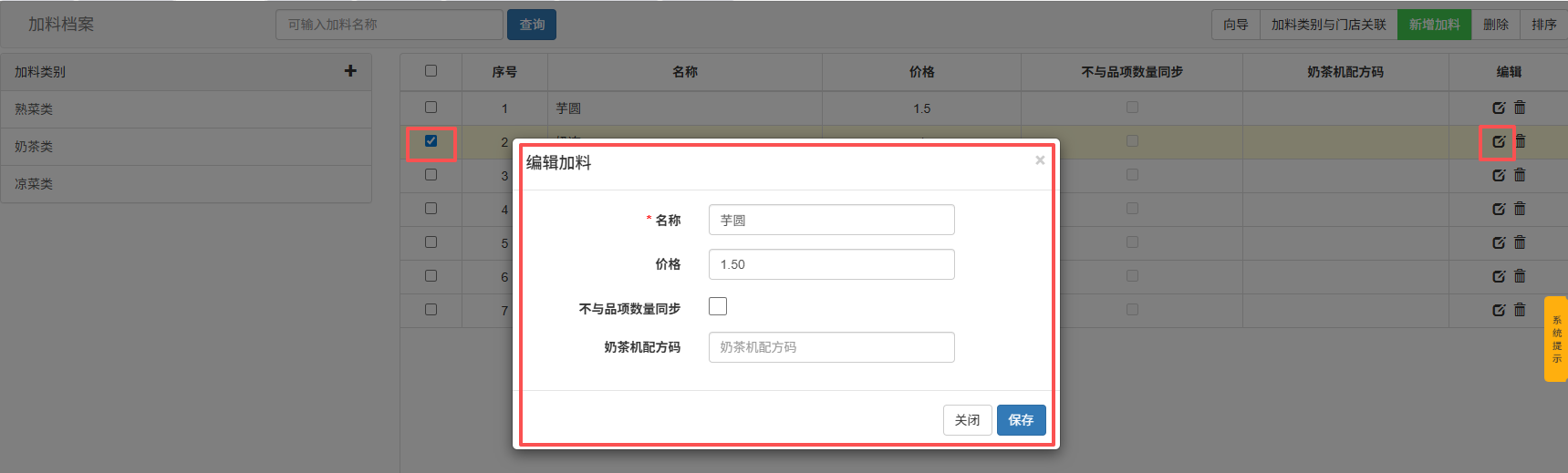 - 编辑:单选一个加料档案进入详情页编辑,可编辑名称、价格、奶茶机配方、销售改价、不与品项数量同步;