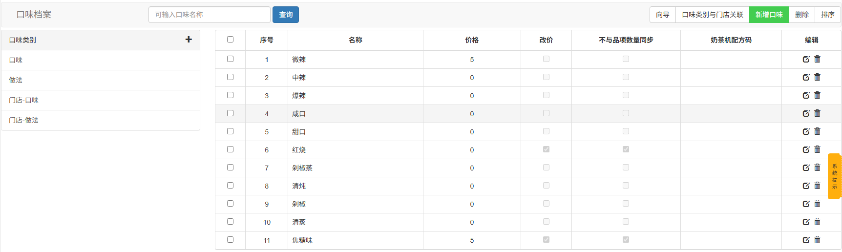 - 编辑:单选一个品项口味进入详情页编辑,可编辑名称、价格、奶茶机配方、销售改价、不与品项数量同步;