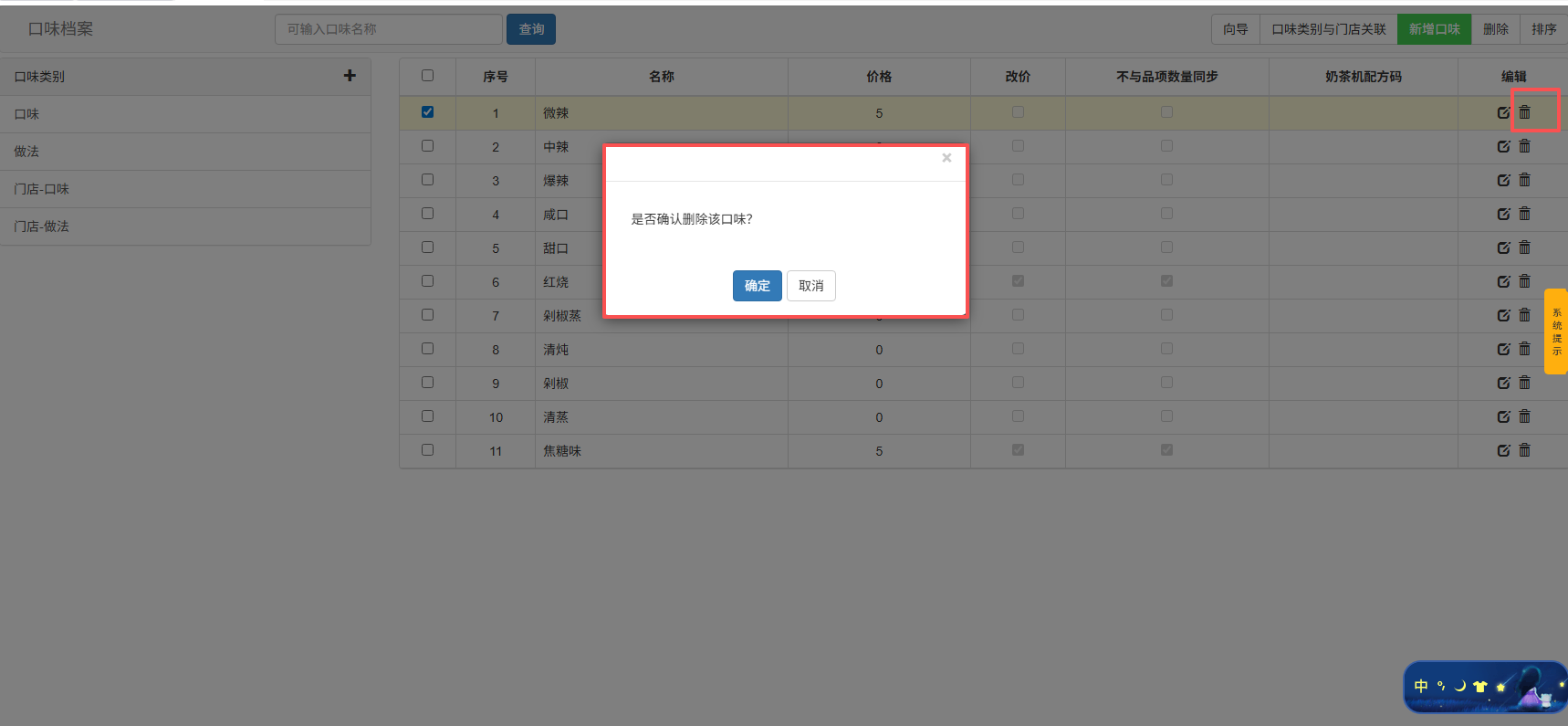- 删除:删除口味信息。如果该口味信息已关联了品项,则删除操作会失败,需要先解除关联才能删除。