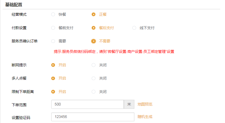 分为两种:快餐、正餐。快餐仅支持餐前支付,正餐支持餐前支付、餐后支付、线下支付。其它参数商家可根据经营模式需要自行设置。
