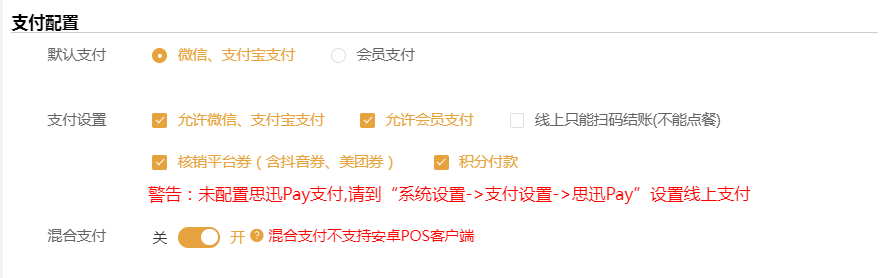 主要设置参数分为:默认支付、支付设置、混合支付等设置参数。根据商家经营需要设置支付参数保存下传数据即可生效。