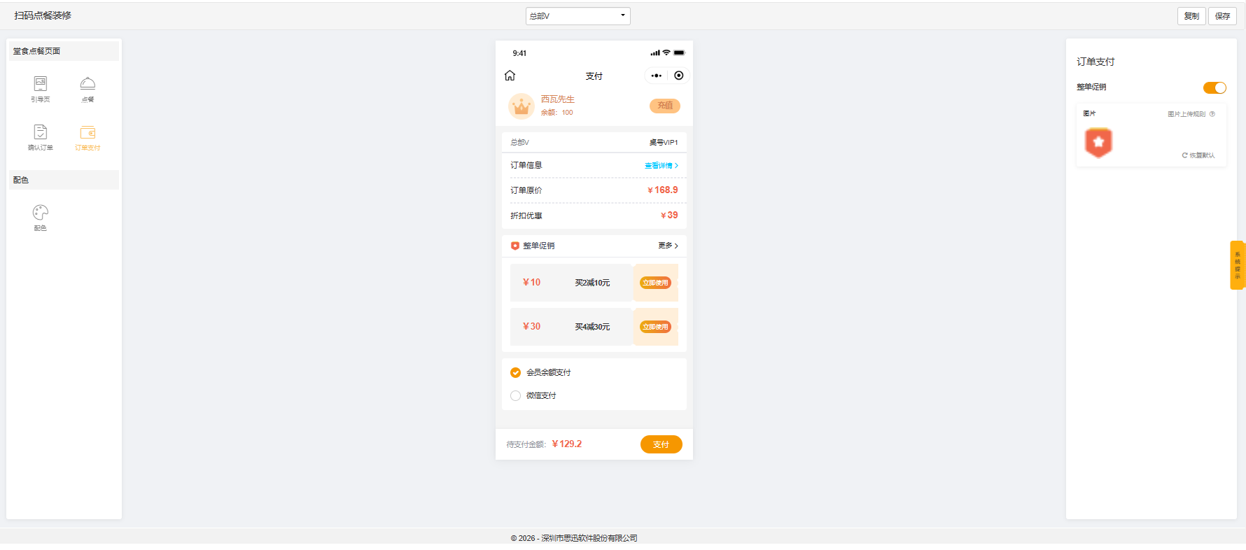 可设置 商家LOGO、门店名称、商家消息、优惠信息、会员信息、会员置顶、会员充值、会员注册