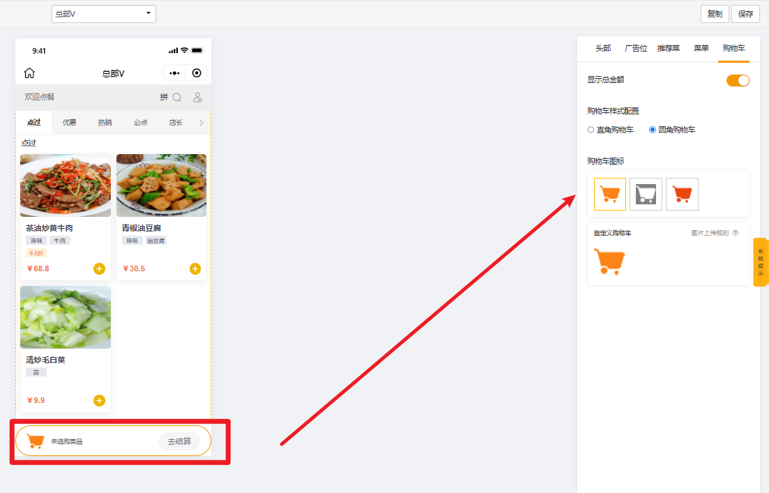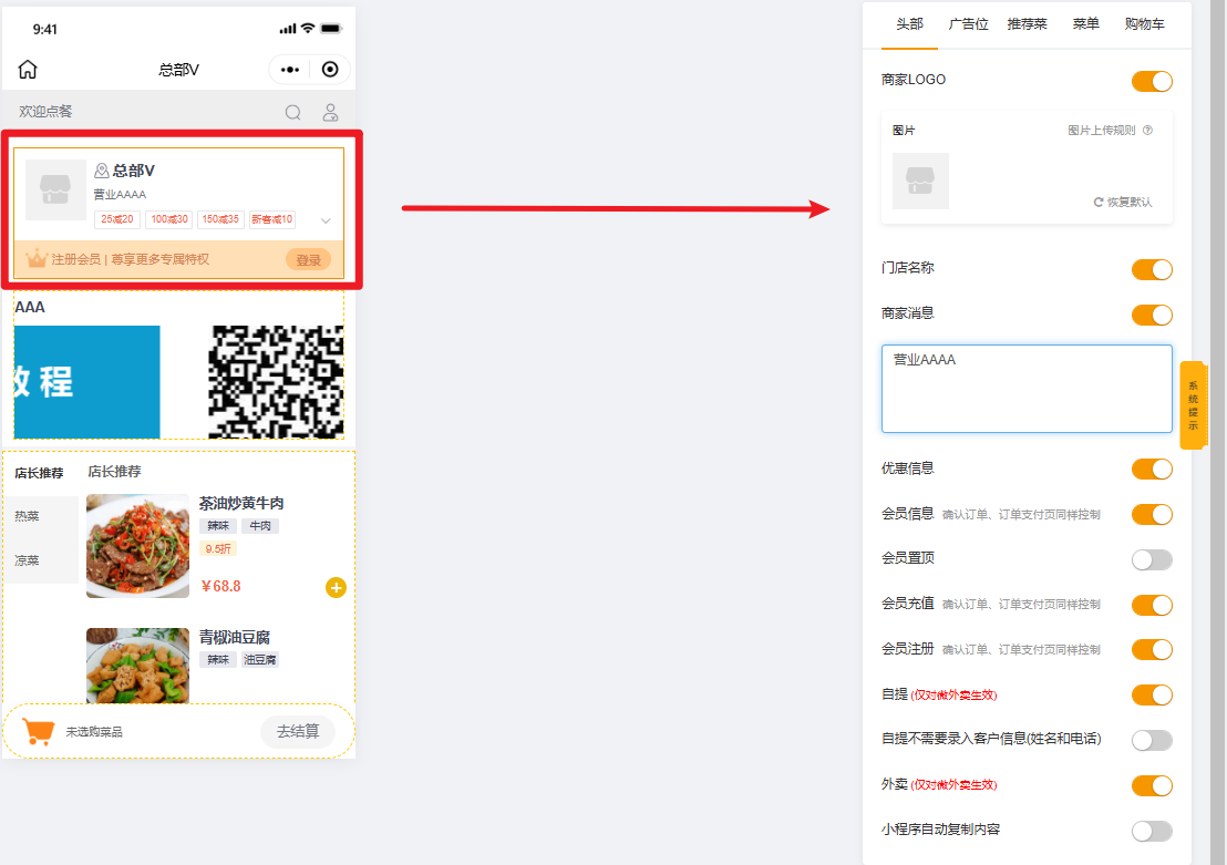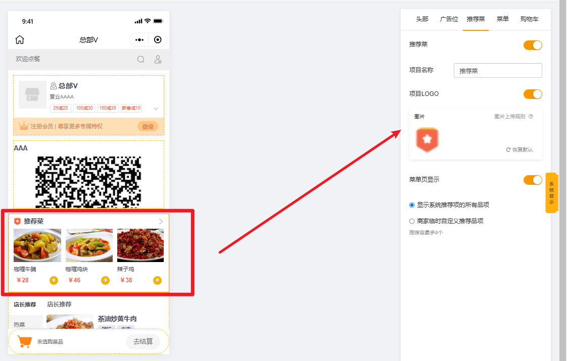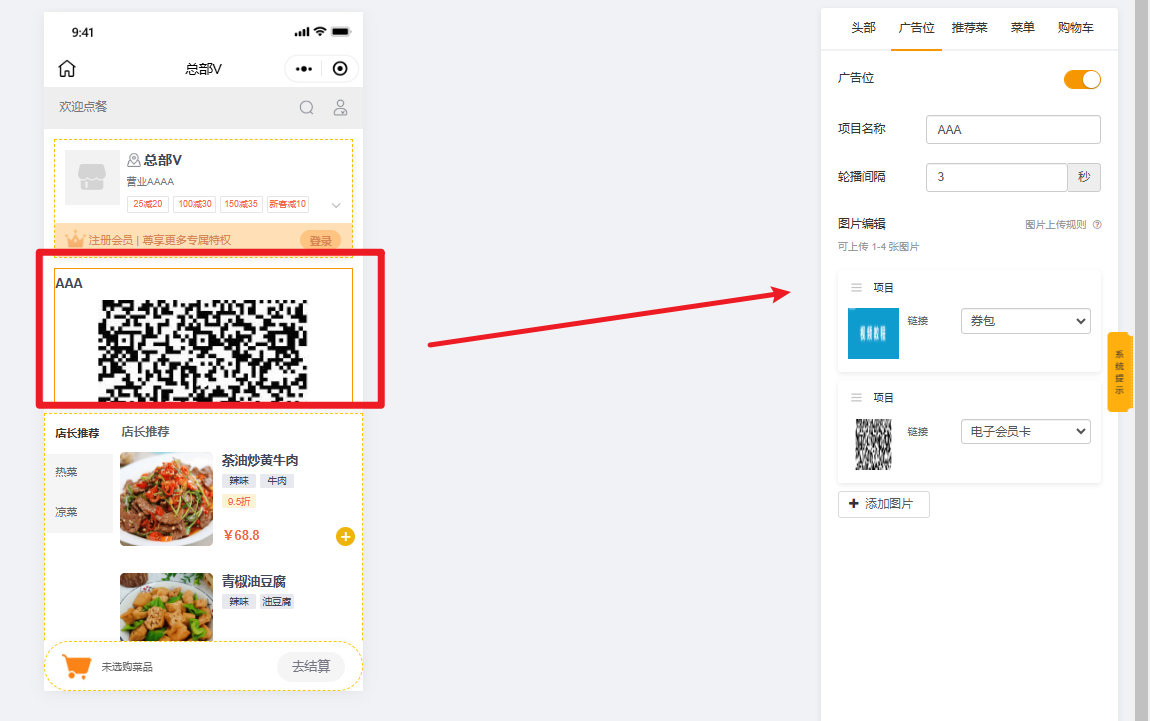 编辑扫码点餐页面,主要编辑内容包含:头部、广告位、推荐菜、菜单、购物车。