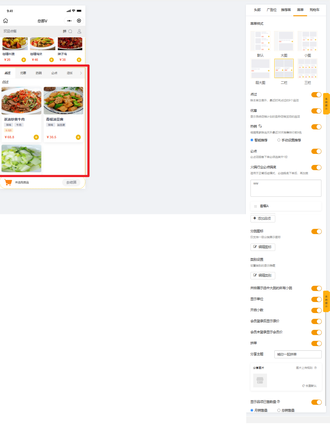 菜单样式、点过品项、优惠品项、热销品项、必点品项、分类图标、类别设置显示单位、开启小数