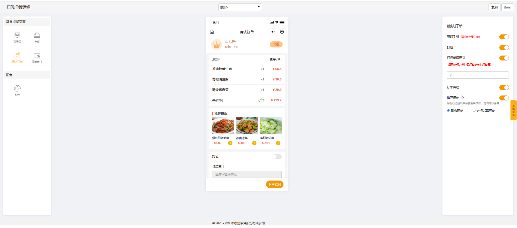 会员信息、获取手机、打包、打包费自定义、订单备注、推荐搭配