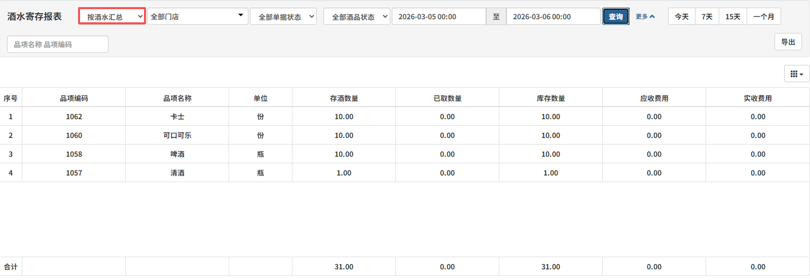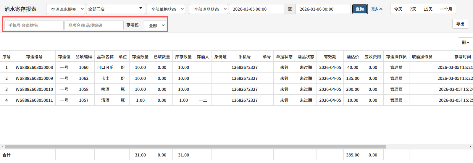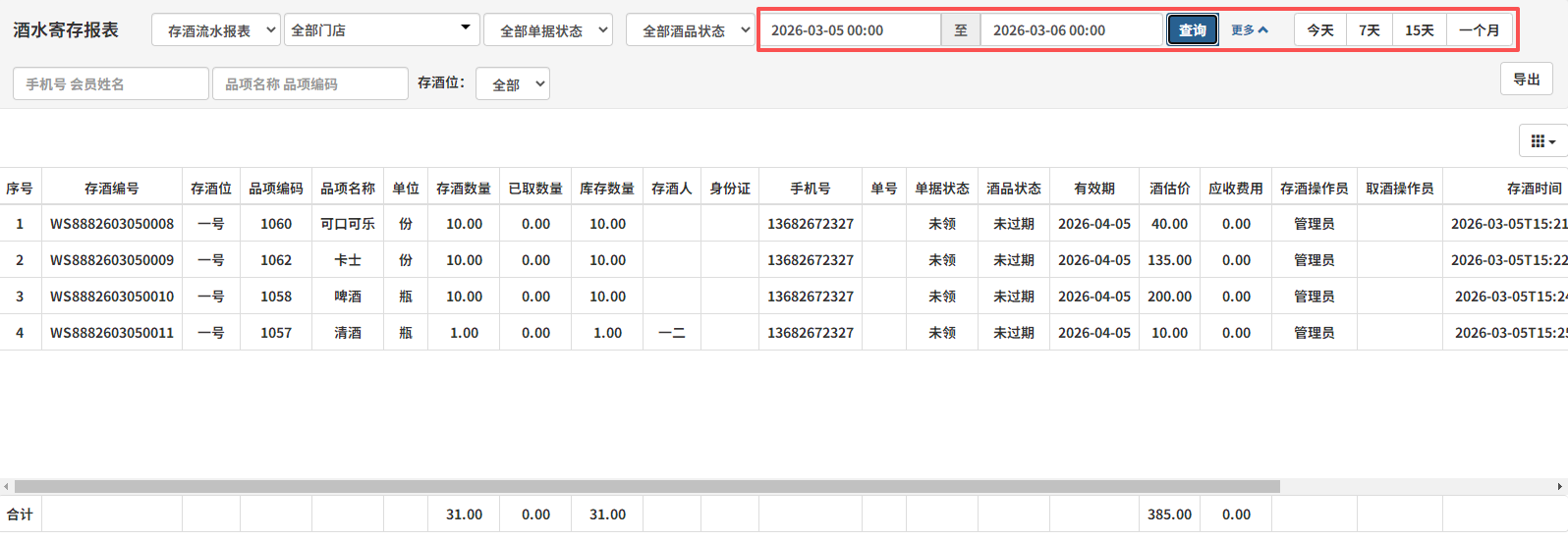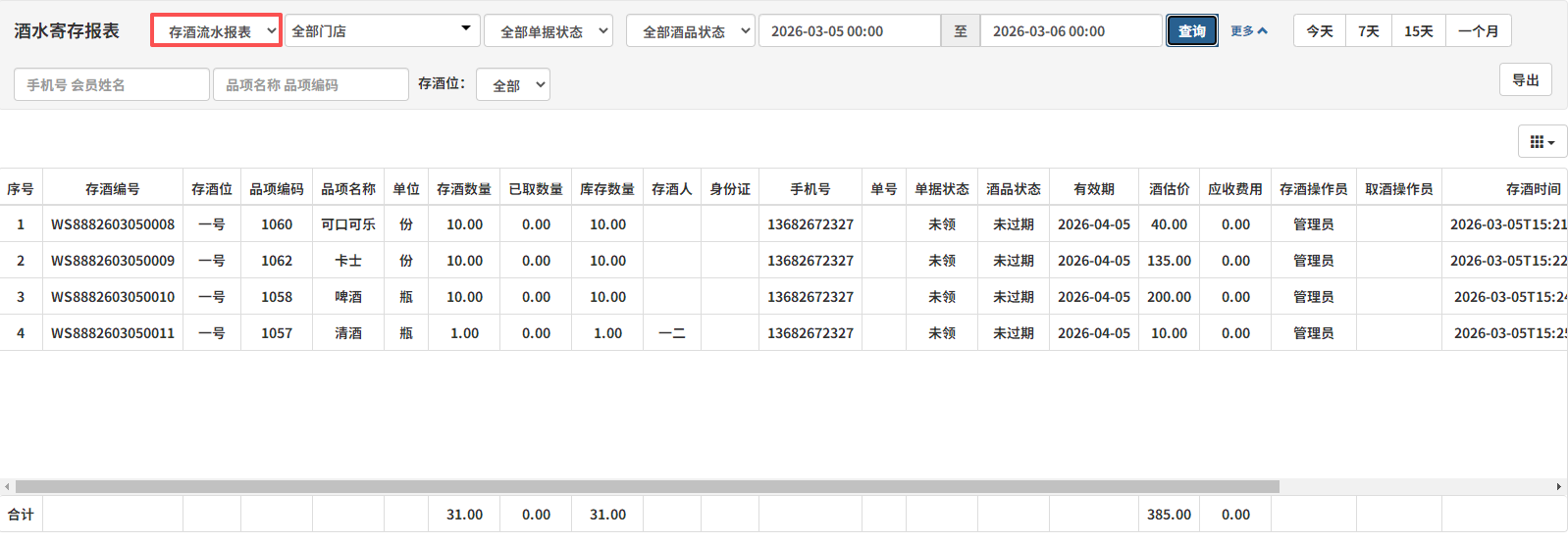 存酒流水报表用于监控酒水寄存全生命周期状态,包含存酒、取酒、过期预警等关键节点管理。