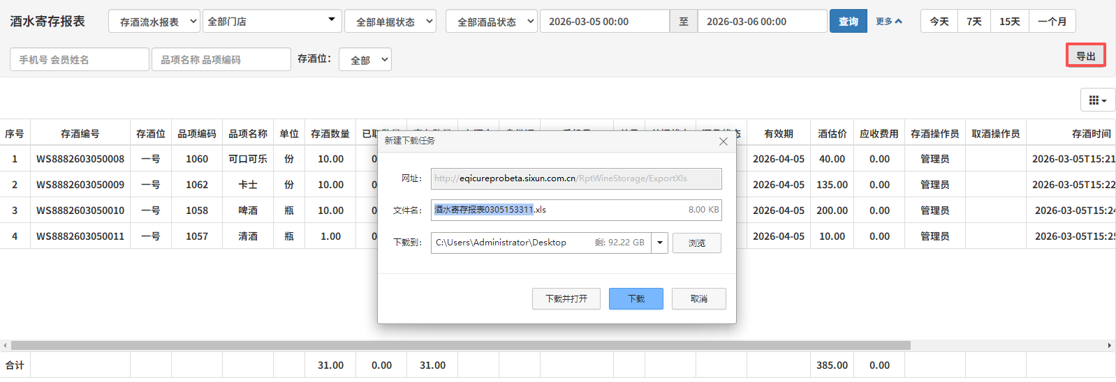 (1)打开管理——点击酒水寄存报表,此功能以网页形式进行展示使用。