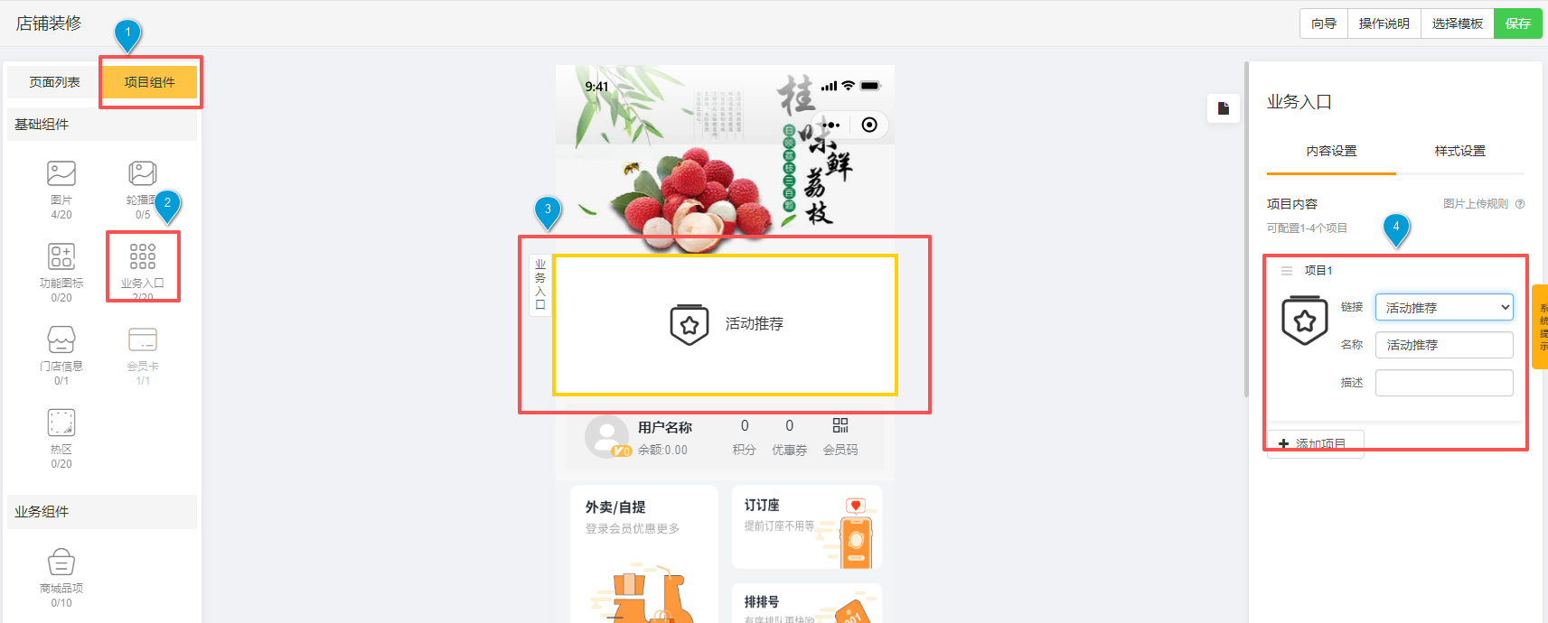 为使会员能够发现并参与活动,需先在后台【微餐厅设置】->【店铺装修模板】的“项目组件”中,添加“活动推荐”业务入口。
