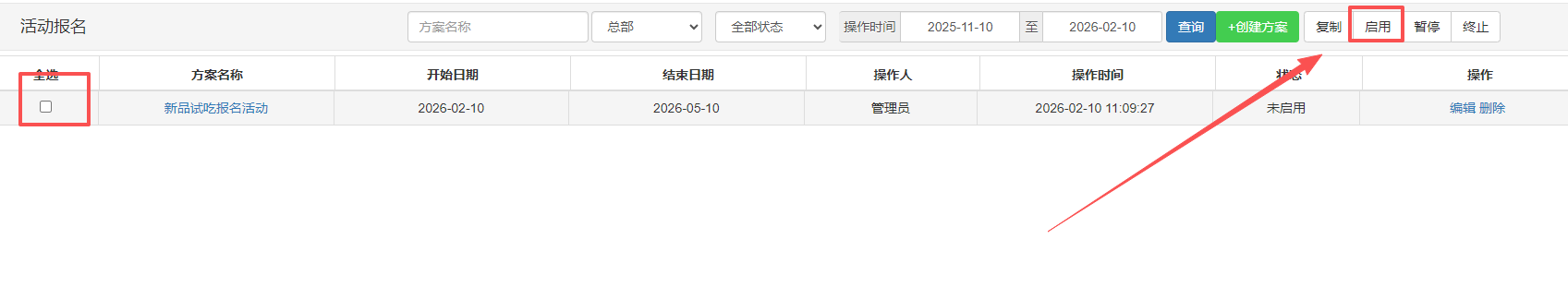 方案保存后,默认状态为“未启用”。需手动选中该方案并点击【启用】,活动方可生效并对会员开放。