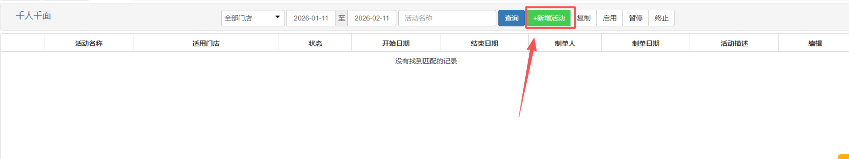 1、在后台【营销中心】->【消费激励】中,选择【千人千面】,点击【新增活动】。