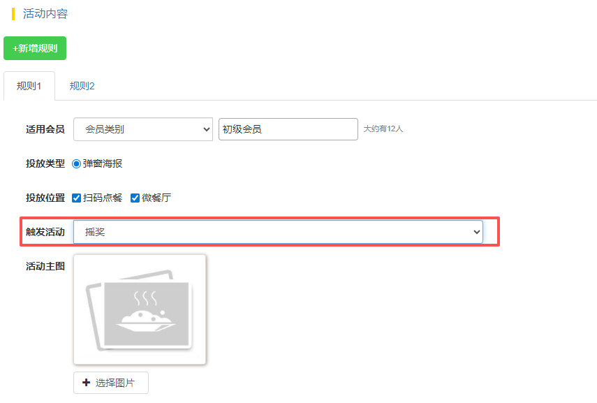 触发活动:为设置的适用会员的会员设置要弹出的具体活动(如某个充值赠送、拼团活动)及对应的弹窗海报。