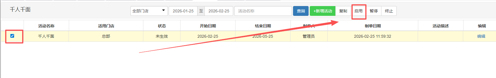 活动新增并保存后,默认处于“失效”状态。需在活动列表中选中该方案,手动点击【启用】,规则方可生效。