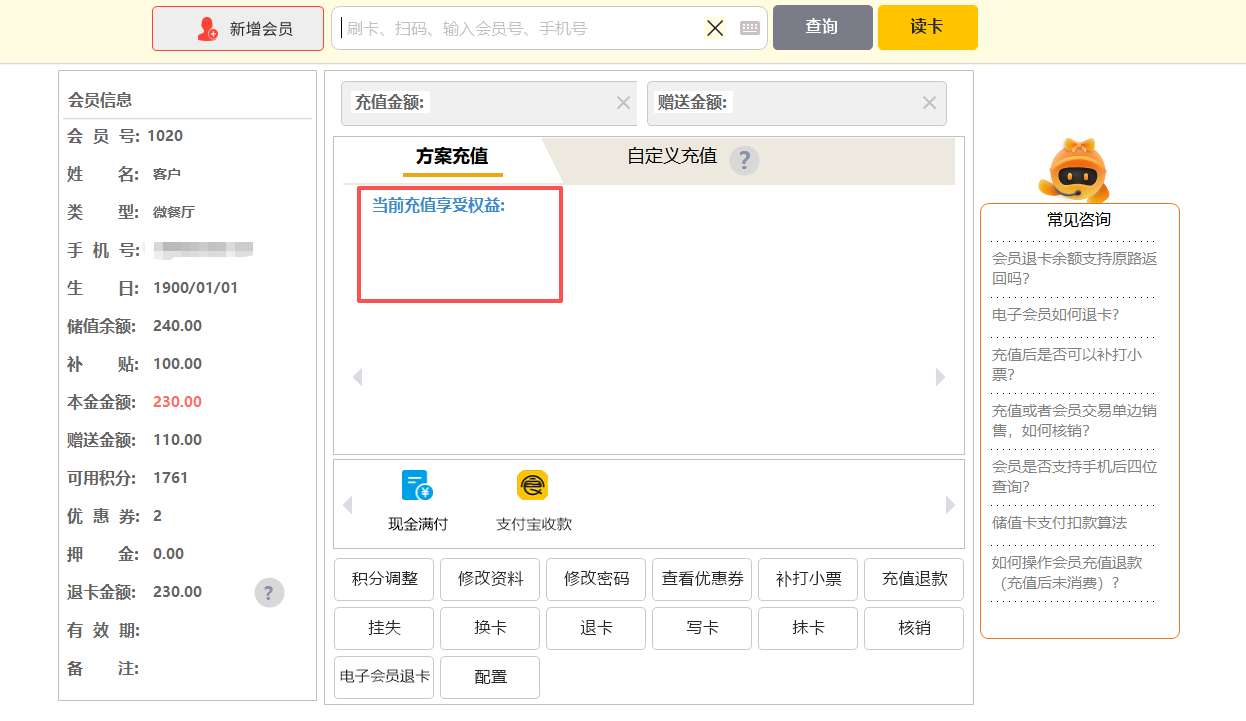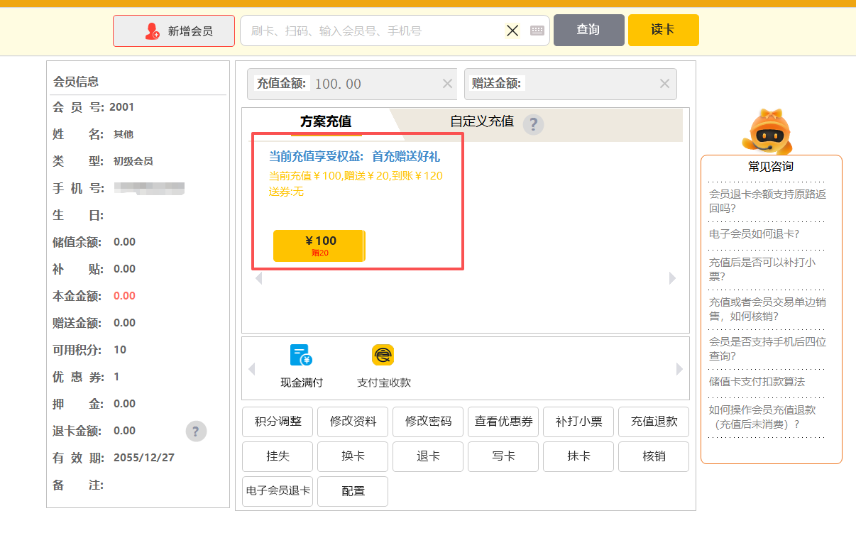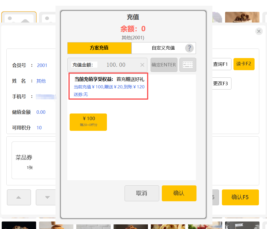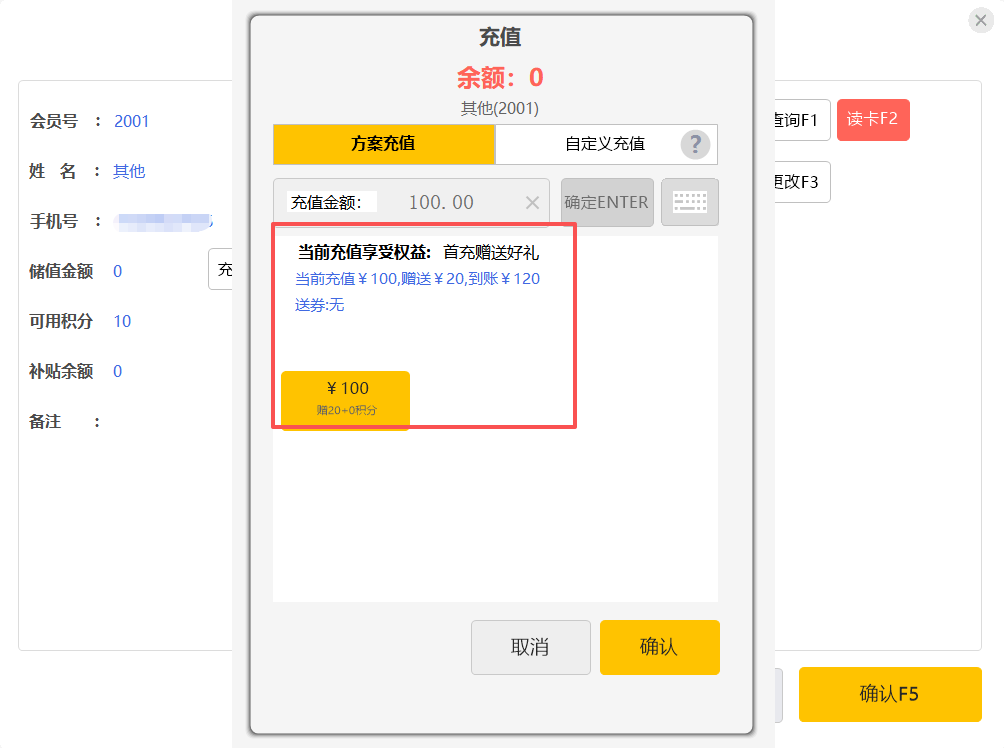 前台点击进入【会员】模块,输入会员号查询,若该会员从未充值,界面将自动显示“首次充值赠送”的方案。选择方案并完成支付后,充值及赠送将立即到账。