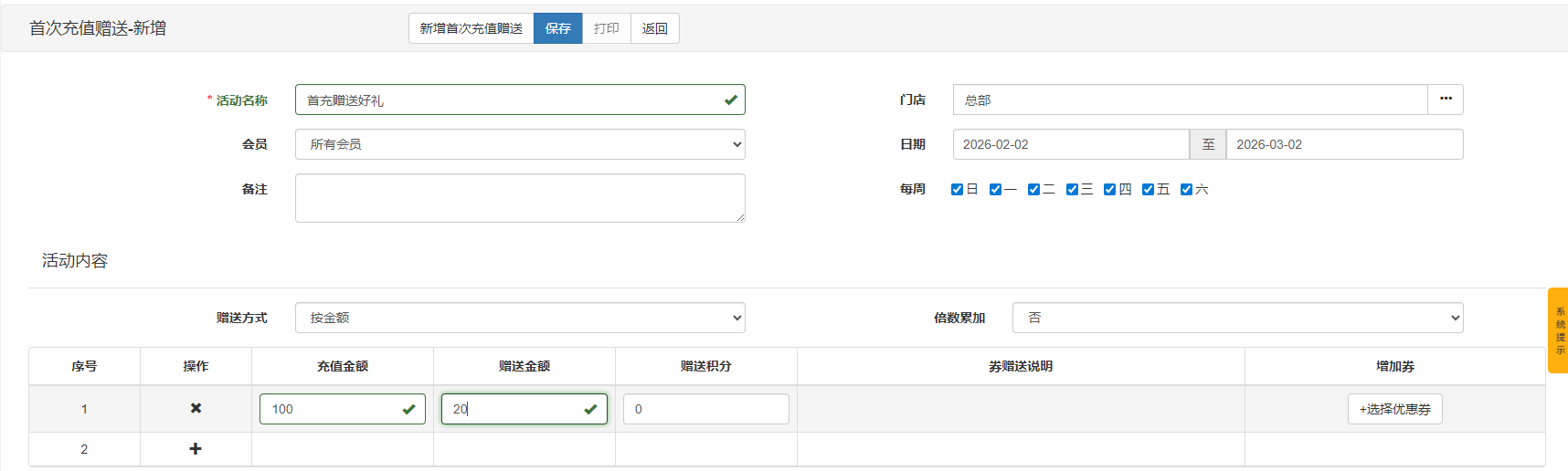 功能概述:“首次充值赠送”是一项针对从未进行过充值的会员设计的专项营销活动。当新会员完成首次充值时,商家将给予一定的金额、积分或优惠券作为激励。其核心目的在于提升新会员的充值转化率,快速锁定客户并促进后续消费,是会员体系拉新与激活的有效工具。