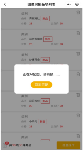 5.图片识别完成,进入图像识别品项列表,默认为所有品项进行AI配图,需要等待10秒左右,不需要AI配图点击取消匹配按钮即可。