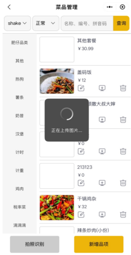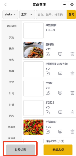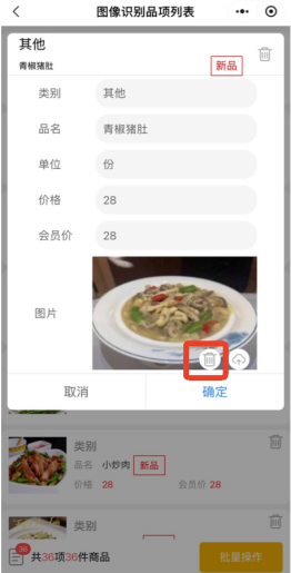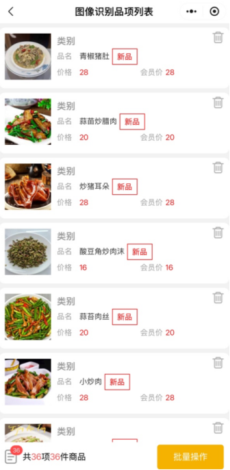 6.匹配品项图片完成,品项列表显示了品项图片、品名、价格、会员价和识别的品项数量,目前暂没有识别类别功能,需要手动选择类别。如有不需要的品项可以点击品项右边的删除按钮,即可删除品项。