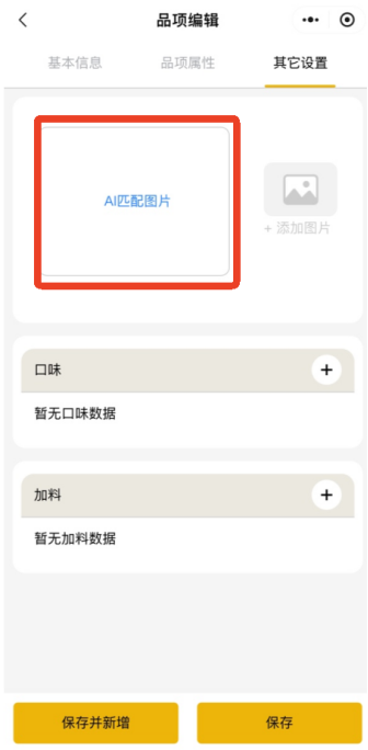 1.手动新增品项或编辑已有品项,点击其他设置,点击AI匹配图片,即可自动匹配当前品项的图片。