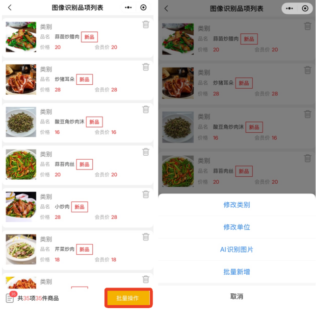 点击品项列表下方的批量操作按钮,即可对品项进行批量修改类别、修改单位、AI识别图片和新增。