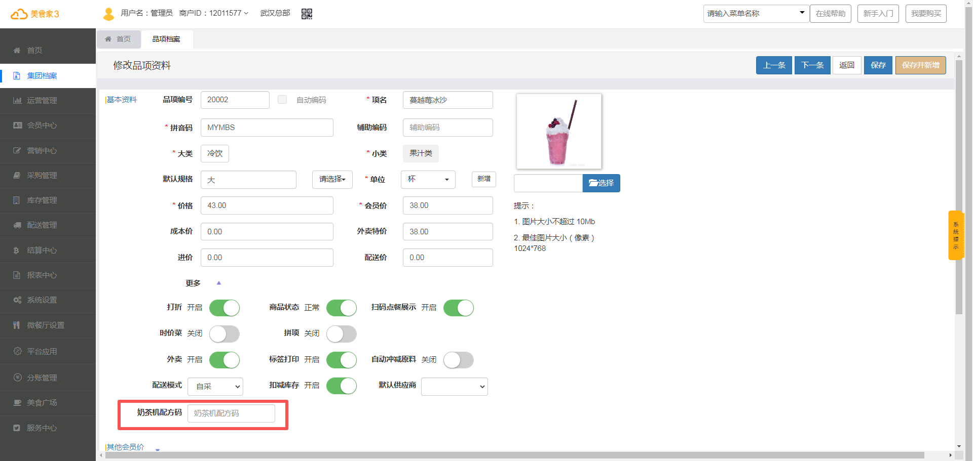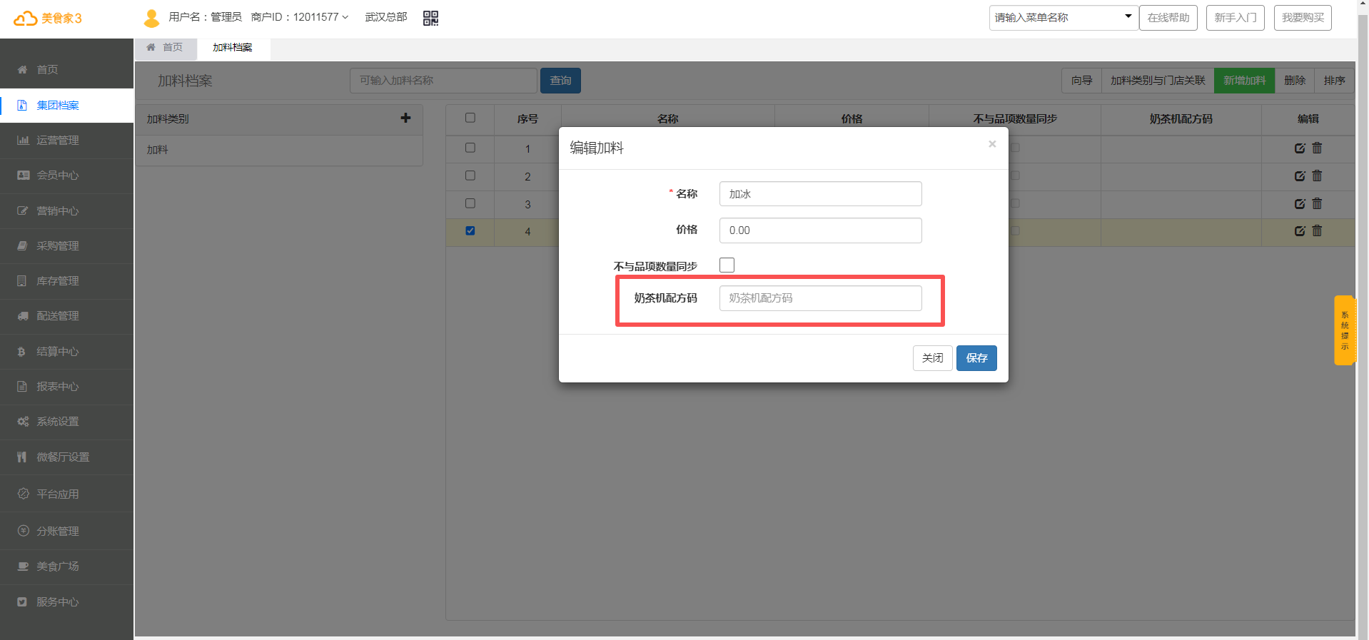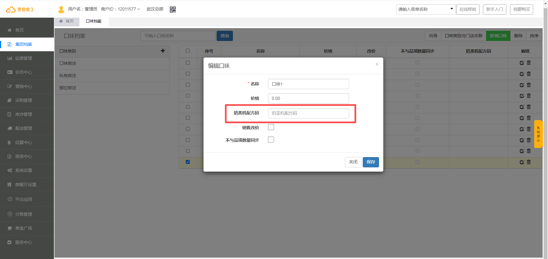 1.1、品项档案增加奶茶机配方码