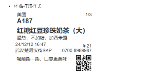 介绍:奶茶机的对接,实现了品项信息、规格、口味、加料与奶茶机的关联。前端点餐后,杯贴会即刻打印出奶茶机二维码,店员或客户只需扫码将信息传入奶茶机,奶茶机就会根据接收到的信息自动制作饮品,整个过程无需人工手动记录和操作。