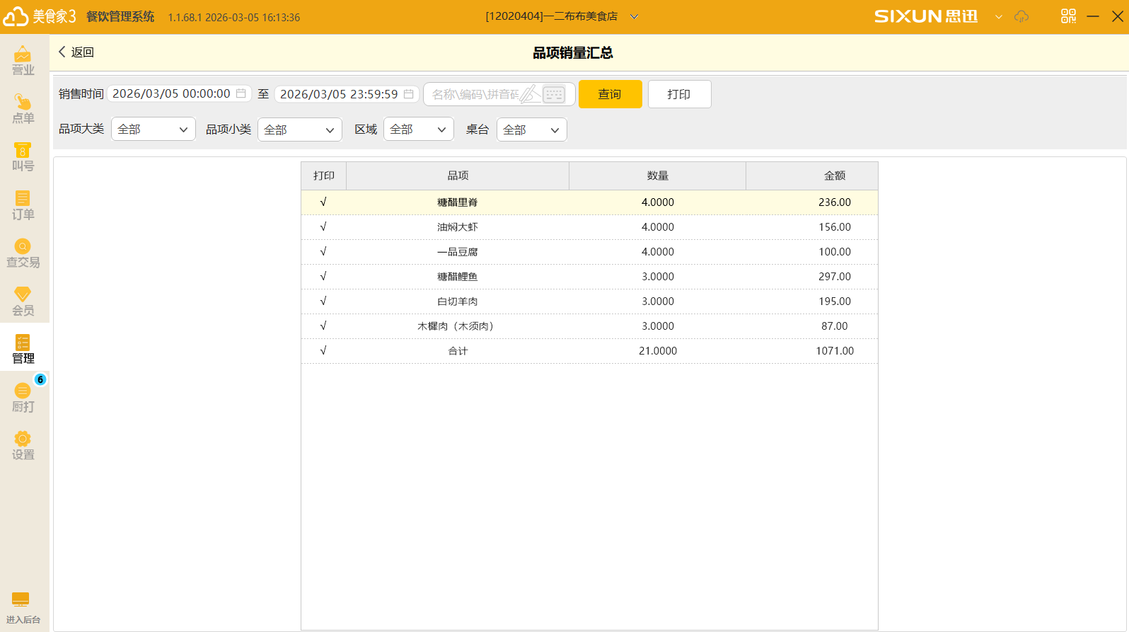 可根据品项大类/品项小类/区域/桌台进行查询。