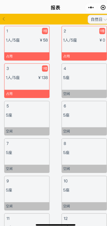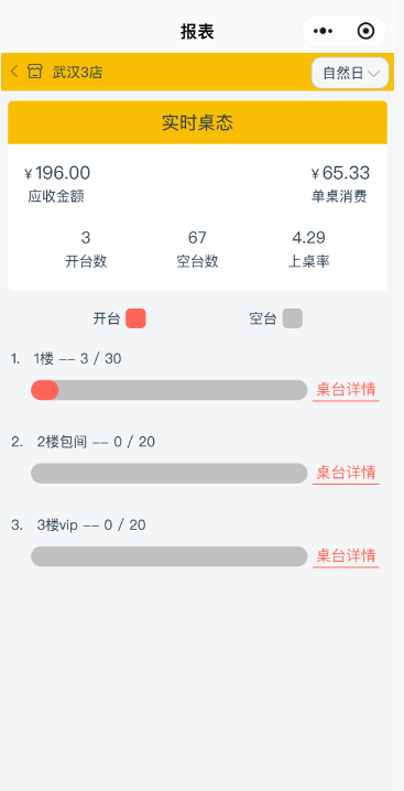 实时桌态可以查看所有桌态的开台情况,当前已开台桌台的应收金额、单桌消费、开台数、空台数和上桌率。