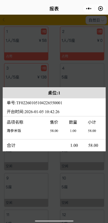 点击桌台详情,可以查看每一个桌台是否开台,以及每个桌台当前的消费金额;点击桌台还可以查询该桌台的点菜明细。