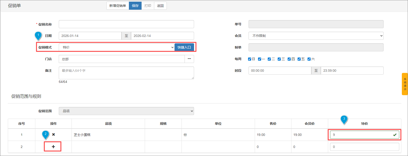 1、在促销计划中点击【新增促销单】,促销模式选择特价,促销范围默认品项。