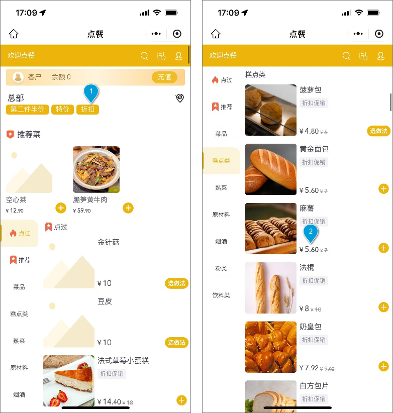 点餐界面左上角显示当前生效的促销活动名称,折扣商品下方显示“折扣促销”标识,同时显示原价和折扣价,价格对比清晰。