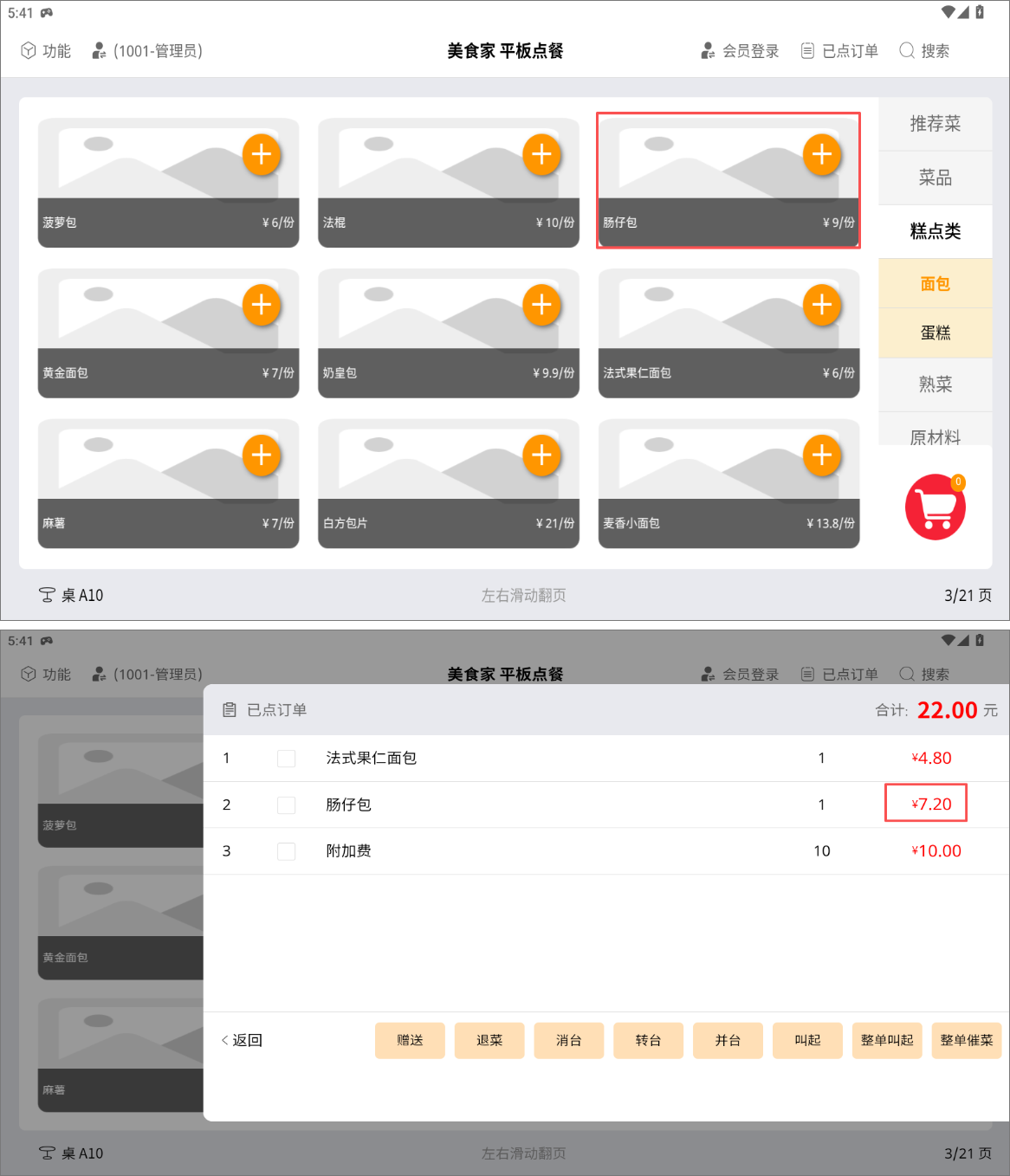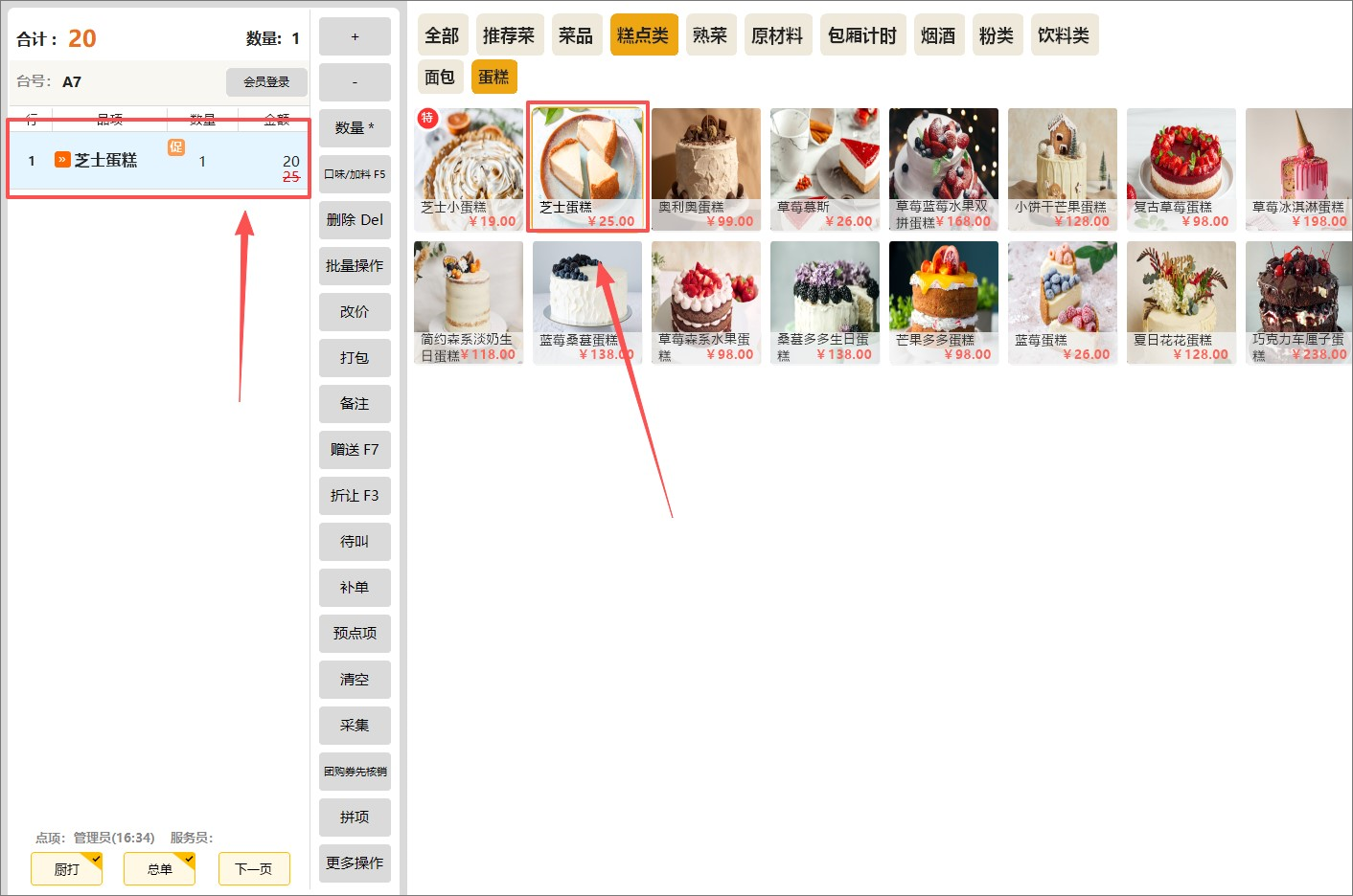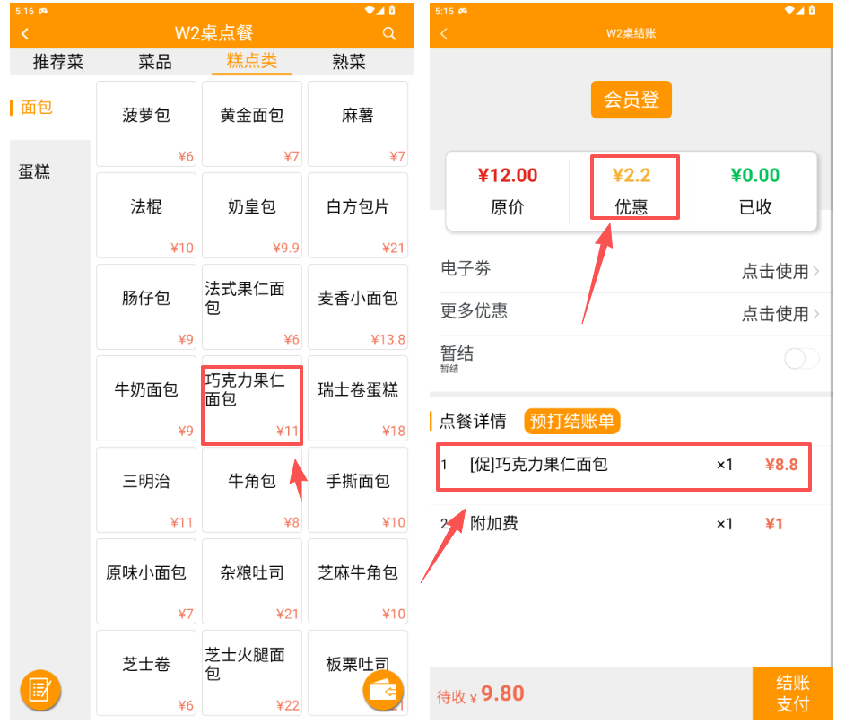 点餐界面商品显示原价,下单结算时系统自动取折扣价格。