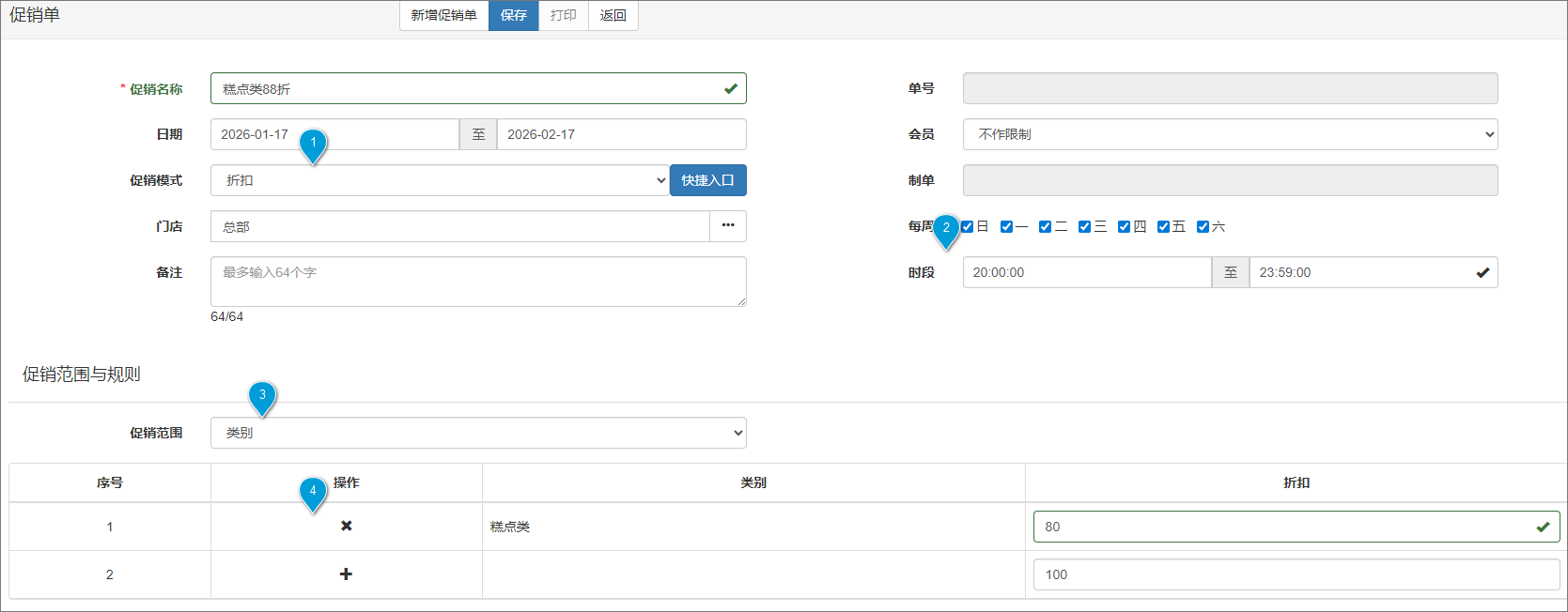 示例:蛋糕店每晚20:00-22:00糕点类享受折促销;