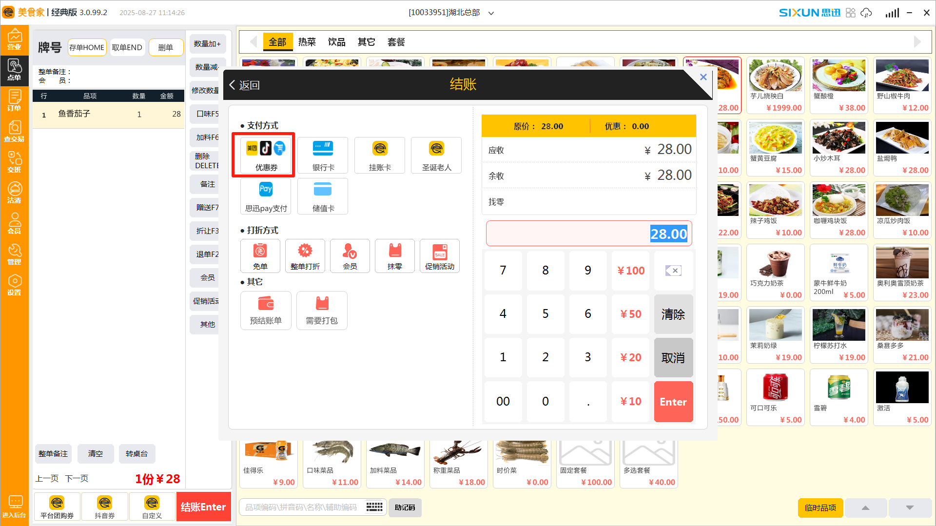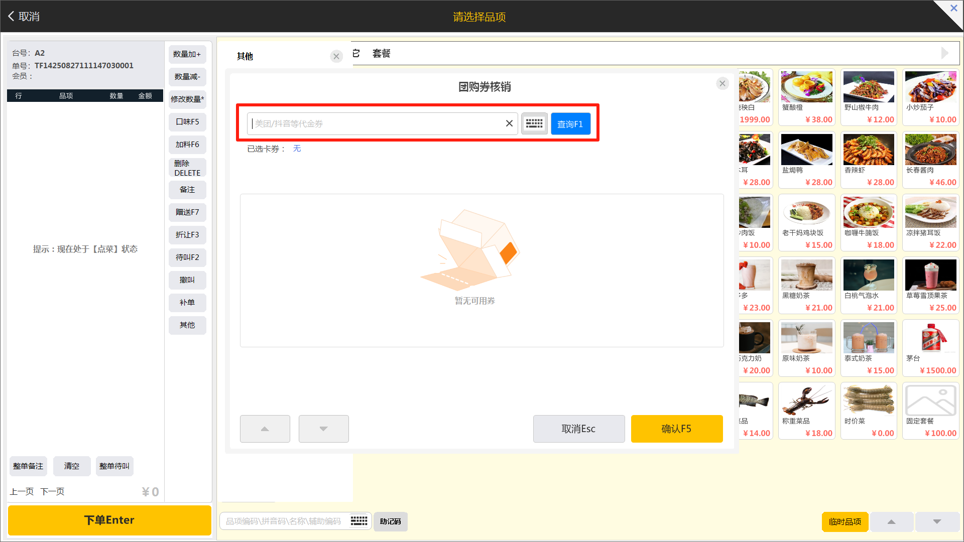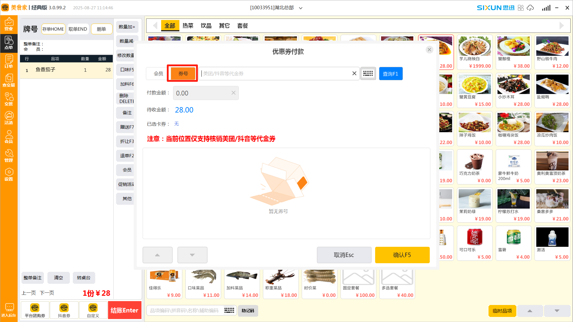 2.2 快餐具体操作方式:门店前台POS,点单模式,点菜-结账,选择“优惠券”,扫描顾客手机端出示的抖音团购券码,完成核销。