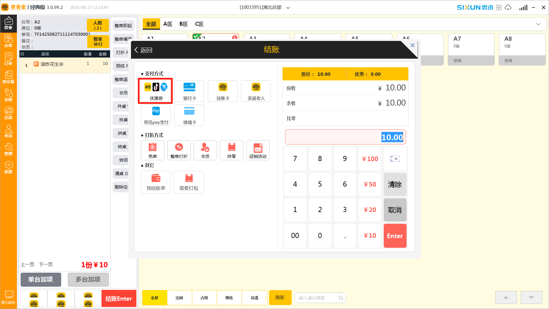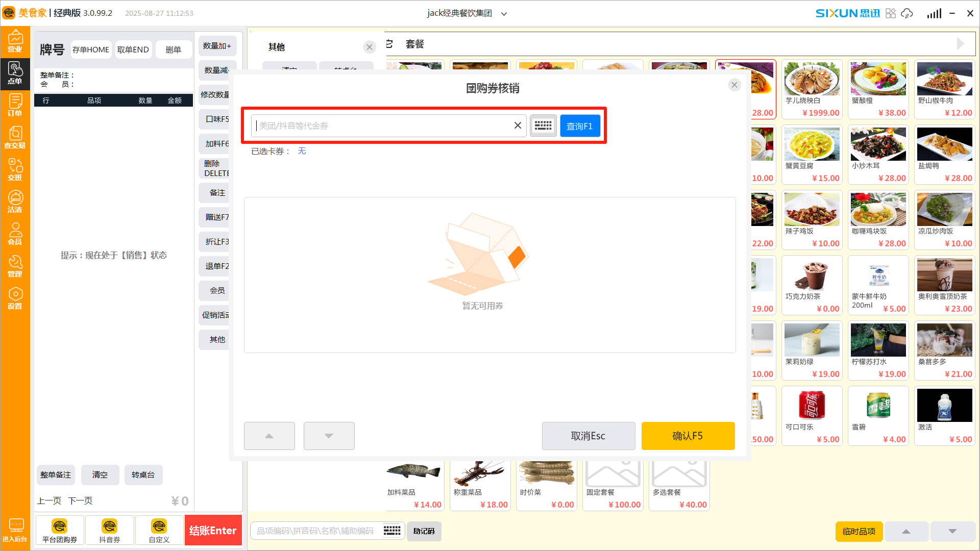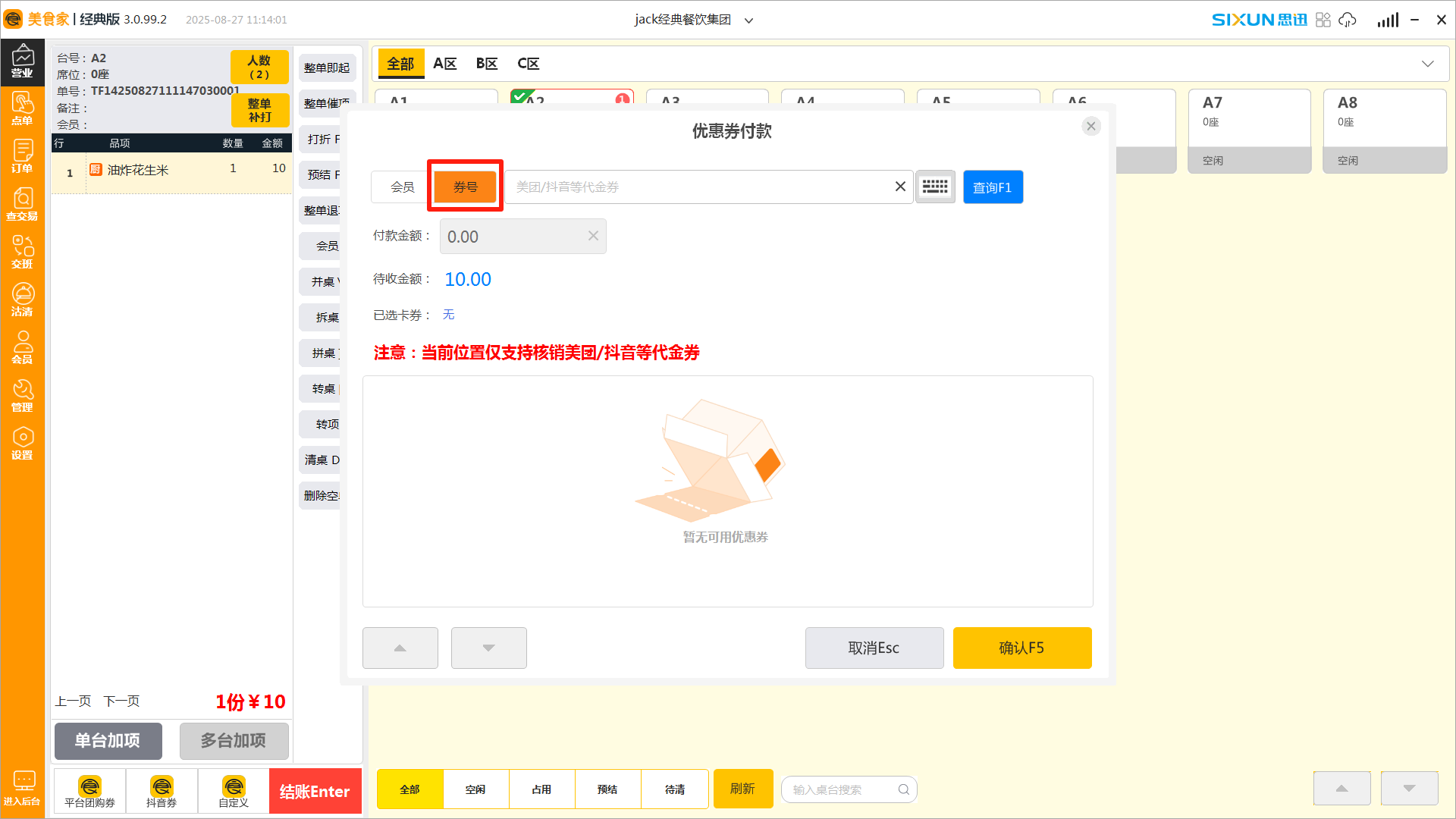 2.2 快餐具体操作方式:门店前台POS,点单模式,点菜-结账,选择“优惠券”,扫描顾客手机端出示的抖音团购券码,完成核销。