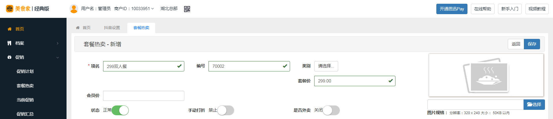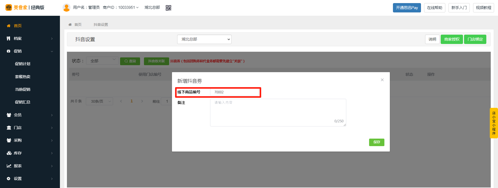 4.1.2 抖音设置中点击’抖音劵关联’,在线下商品编号中填写’299双人餐’的编号70002,点击保存;