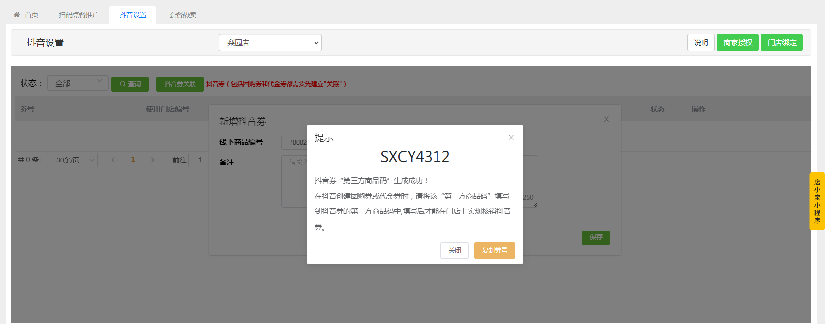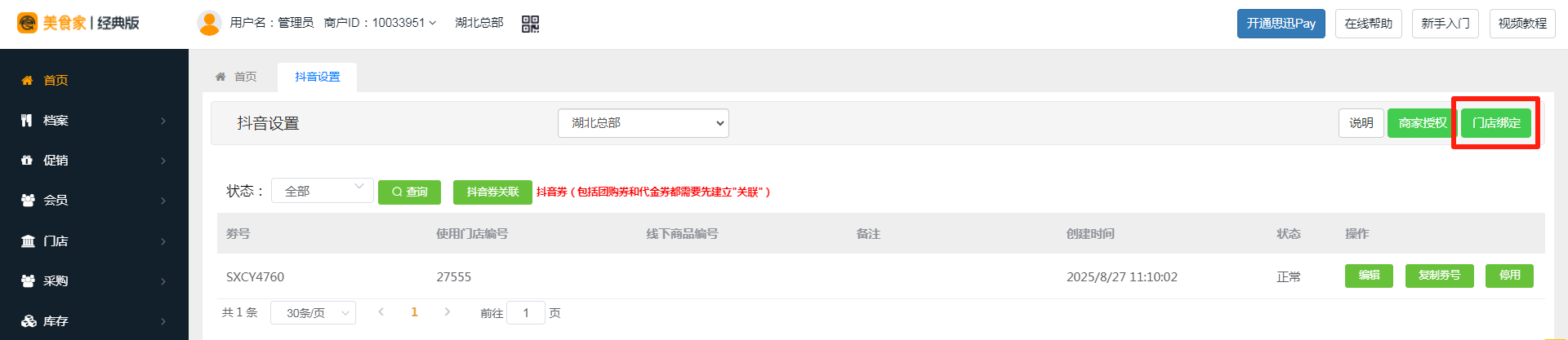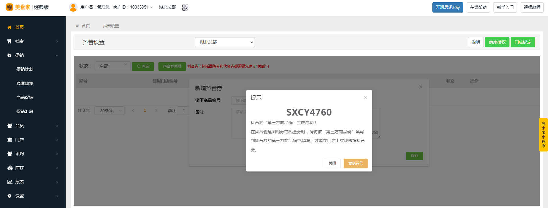 注:在未填写美食家经典版关联劵号前就已经发出去的抖音劵,美食家经典版前台是无法进行识别的,需要关联汇客餐饮劵号后,形成绑定关系开始,购买的的抖音劵才能进行核销使用。