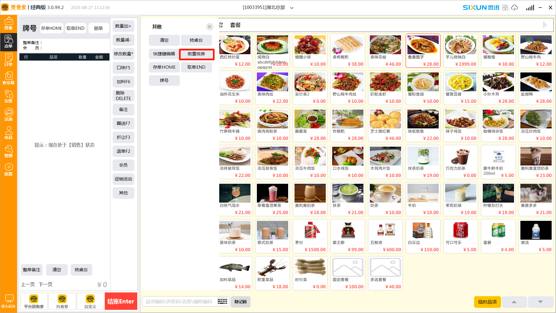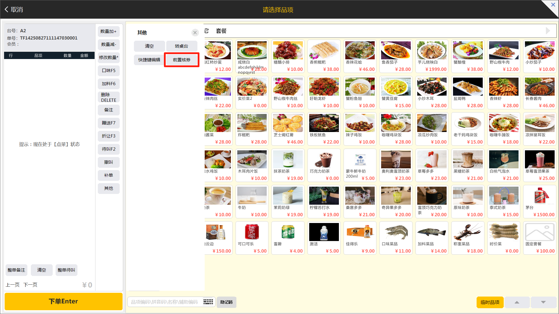 1.2 快餐具体操作方式:门店前台POS点单界面,无需点菜,点击“前置核券”,扫描顾客手机端出示的抖音团购券码,完成核销。