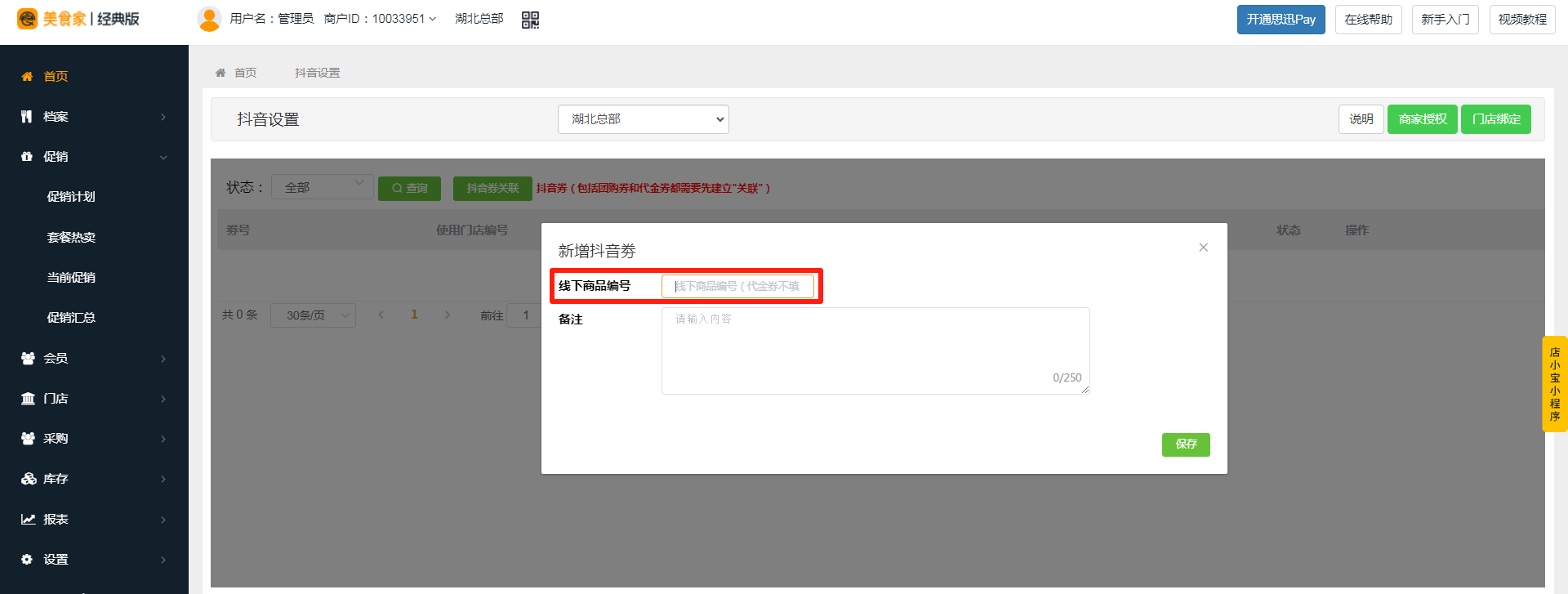 和上面‘4.1 菜品券/套餐券关联绑定’流程一样,也需要和抖音来客后台的代金券进行关联,唯一区别是在美食家经典版后台建立抖音劵关联时,“线下商品编号”为空即可;